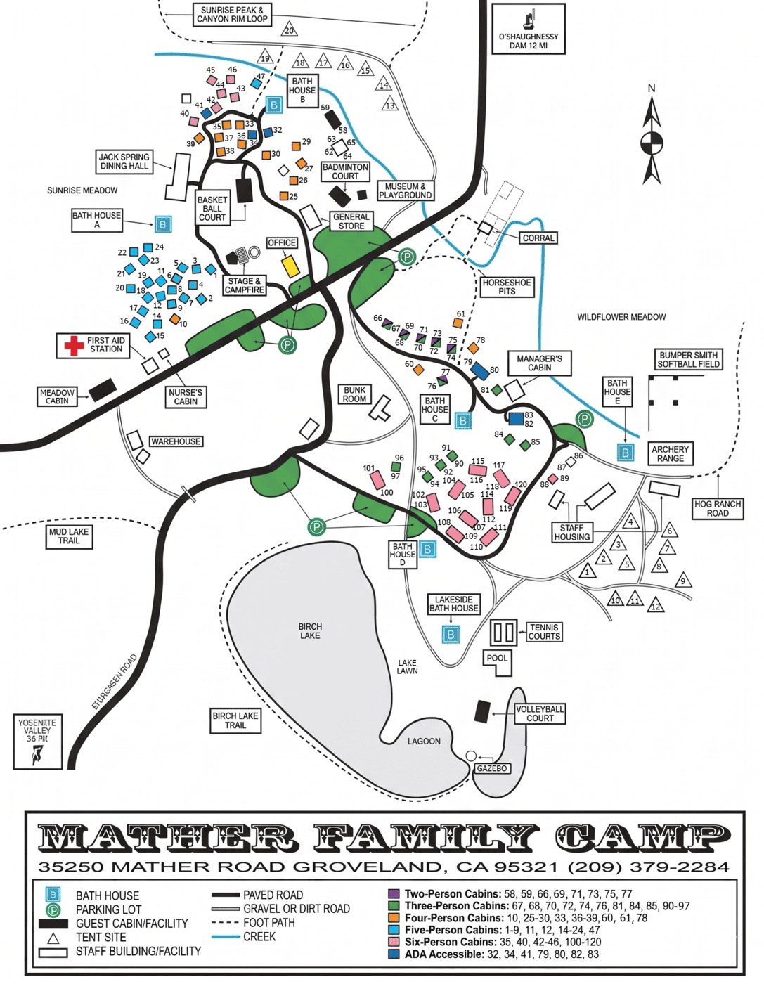 Camp Mather Cabin Map with Color Coded Cabin Sizes