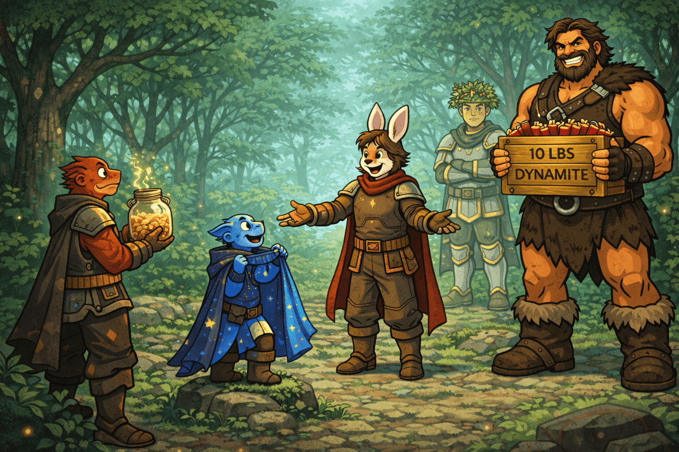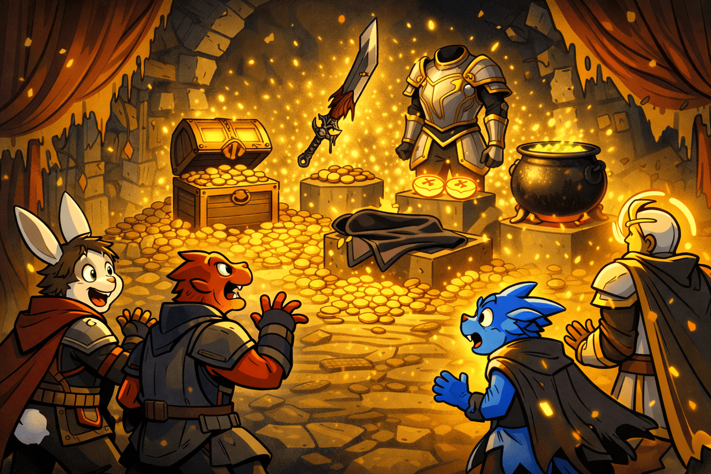 Behind torn tapestries, a secret treasure room bursts with gold and magic. Chests overflow, coins spill across the floor, and legendary items hover on pedestals: a vicious blade dripping shadow, gleaming enchanted armor, glowing wraps, a folded portable hole, and an ominous bubbling cauldron. The party reacts with awe and disbelief—wide eyes, exaggerated expressions, playful wonder. Warm gold lighting, whimsical fantasy energy.
