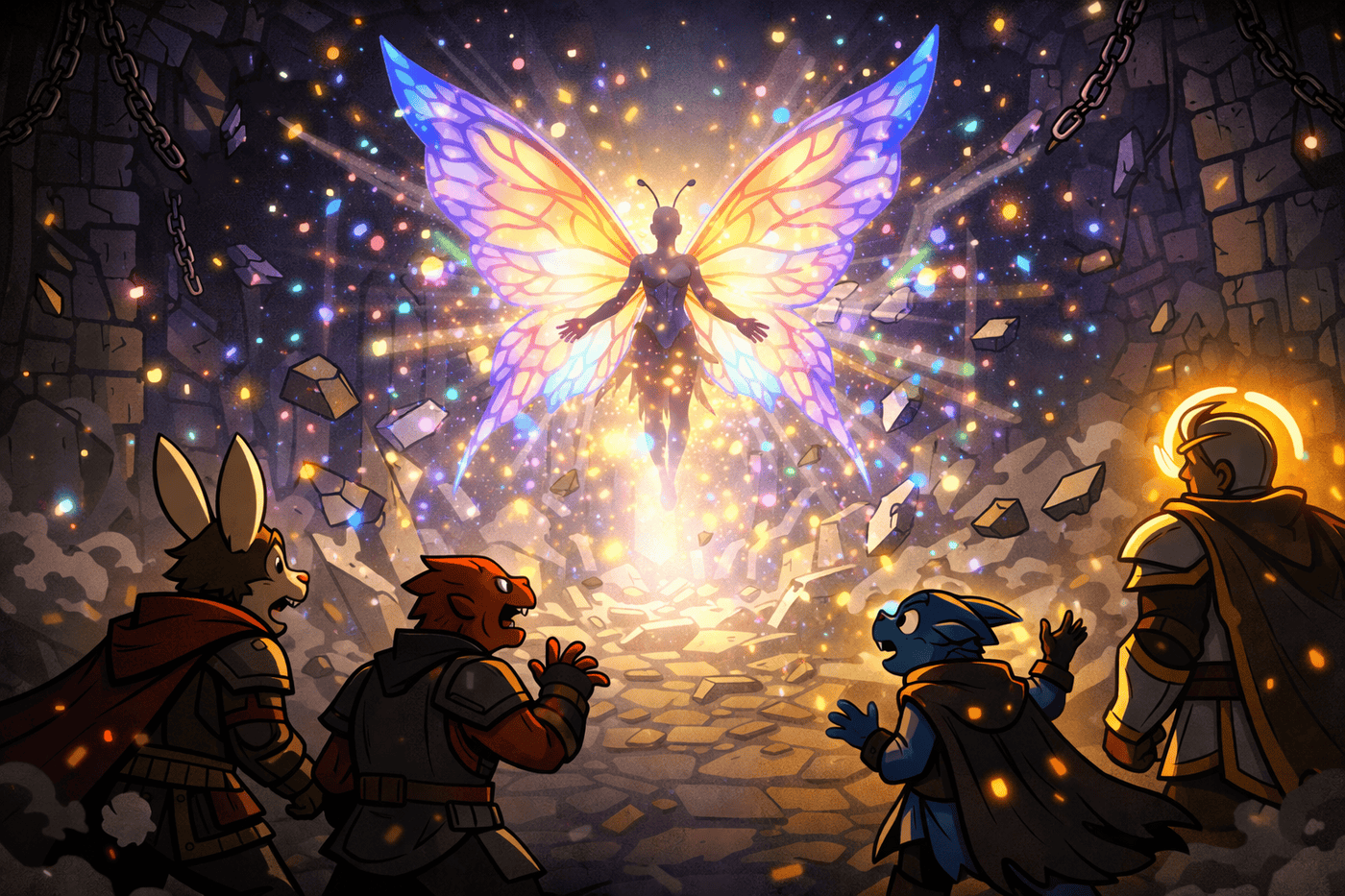 A crystalline prison shatters as a radiant butterfly fae lord explodes free in a storm of wings and glittering pollen. Enormous translucent wings fill the frame, scattering rainbow light across the dungeon. The party shields their eyes, caught between awe and joy. Whimsical, magical, celebratory. Bright colors, floating sparkles, playful motion.