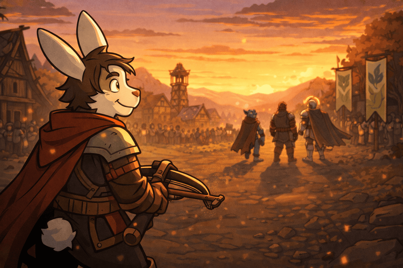 At the edge of Viktal, Boris stands firm as the party prepares to depart. Behind him, fae banners rise and townsfolk gather, uncertain but hopeful. Boris looks resolved yet bittersweet, giving a final nod to Haru, Kiet, and Sundr. The others look conflicted—proud, sad, grateful. Strong silhouettes, warm sunset tones, heroic farewell energy.