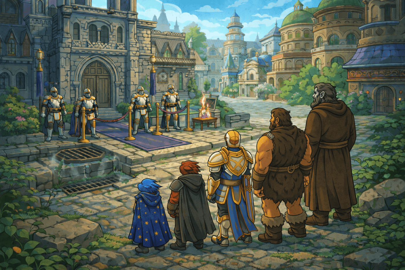 The party arrives at the Radiant Citadel as Shield Bearers stand guard at the Tepest embassy under a shimmering magical shield. Perfumed incense wafts through the air, barely masking an ominous sewage haze rising from sealed sewer grates guarded by soldiers. The city gleams above—but something feels wrong below. Clean architecture contrasted with subtle unease.