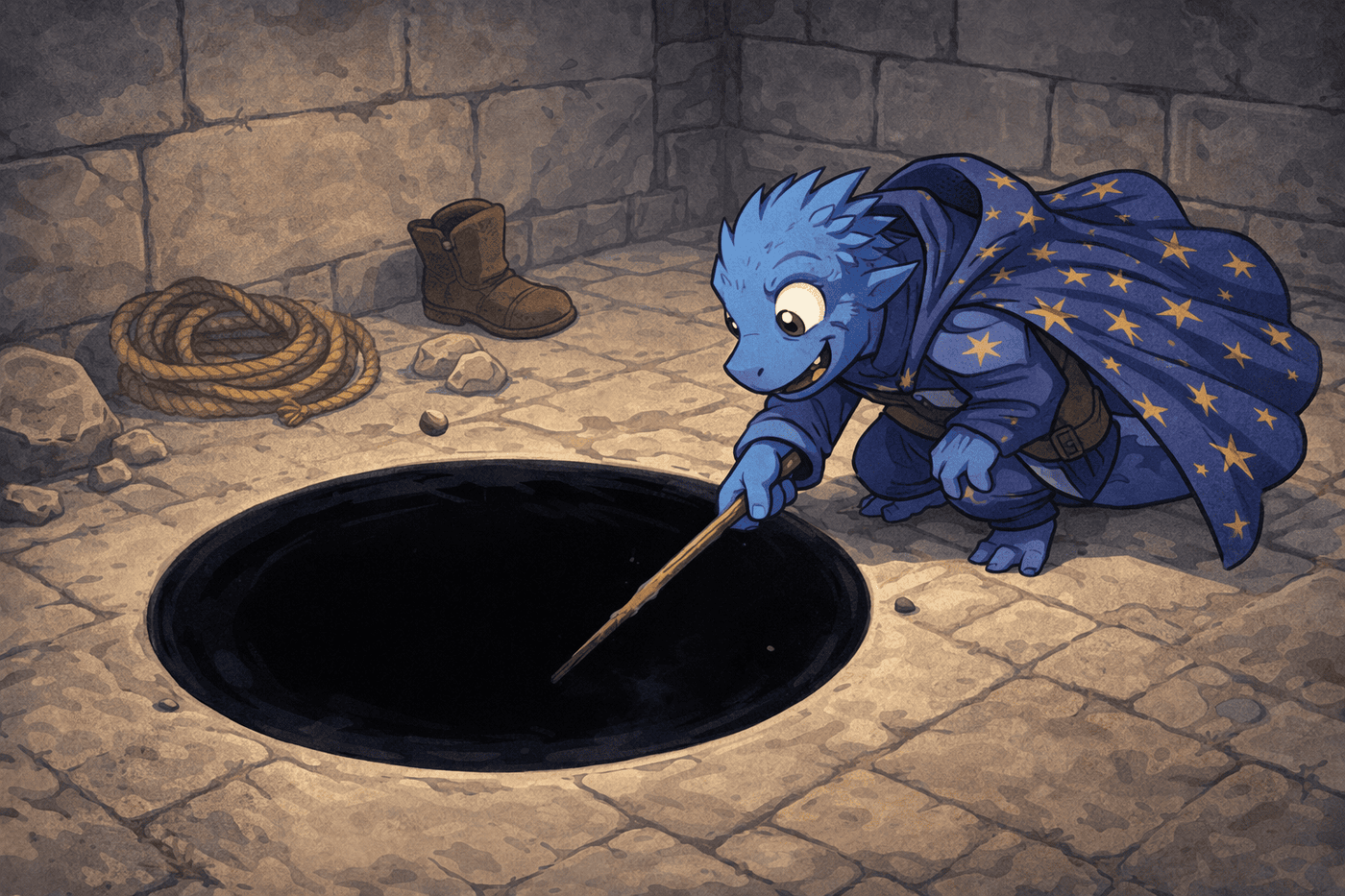 In a quiet corner of a stone chamber, Haru, a small blue kobold, crouches curiously beside a portable hole laid flat on the ground. The hole appears as a perfectly round patch of absolute blackness, subtly warping the stone floor around it. Haru pokes at it with a stick while leaning forward, eyes wide with fascination and mischief.