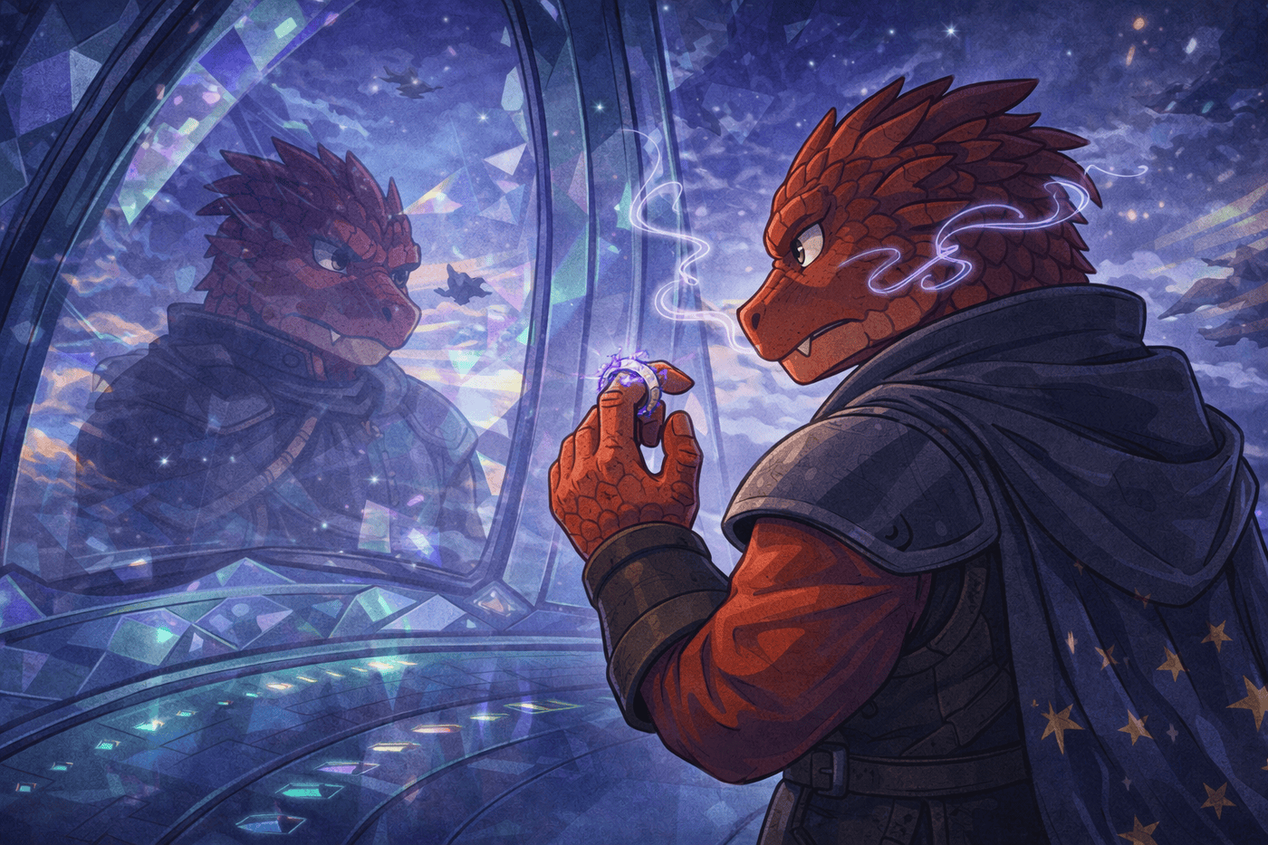 Inside a crystal transport ship gliding through shimmering planar space, Kiet, a dragonborn, stands alone near a faceted crystal viewport. Outside, fractured light and distant floating landmasses drift past in slow motion, casting prismatic reflections across the cabin.