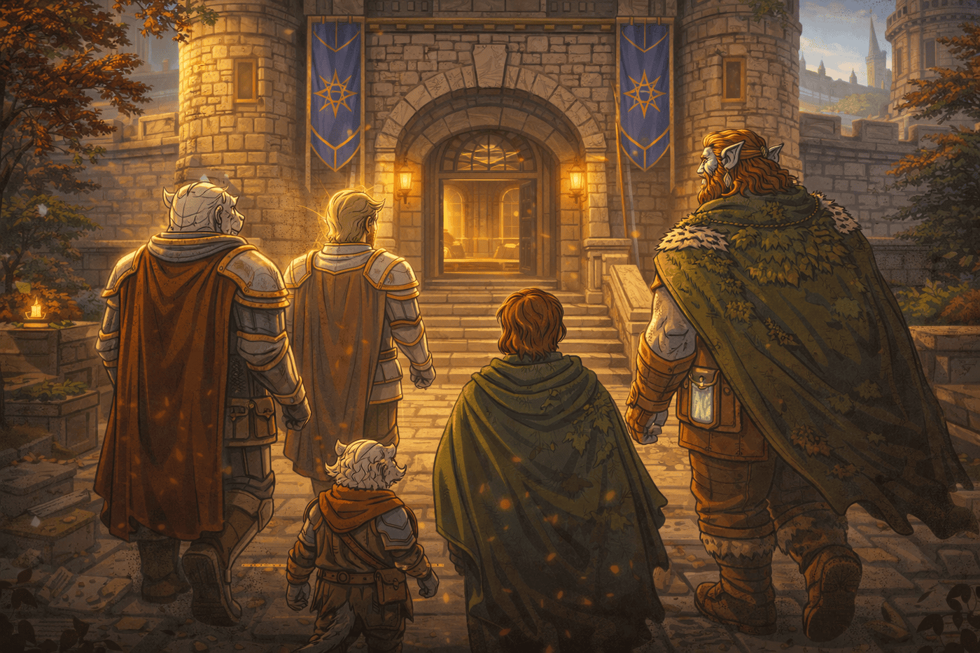 The party is walking together toward the front entrance of their bastion, a fortified stone structure with banners, lanterns, and an open arched doorway glowing warmly from within. The camera is behind and slightly below them, emphasizing scale, unity, and purpose as they approach.