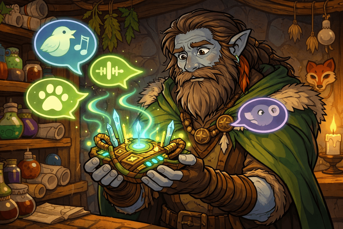 Inside a cluttered arcane workshop, Tovin tests a newly crafted communication device designed for his animal forms. The device is a hybrid of druidic wood, glowing runes, and crystal reeds, softly pulsing with magic. A spectral animal voice visually manifests as floating sound-wave glyphs and tiny illusionary animal heads. Tovin looks both impressed and slightly concerned as the device crackles with imperfect translations.