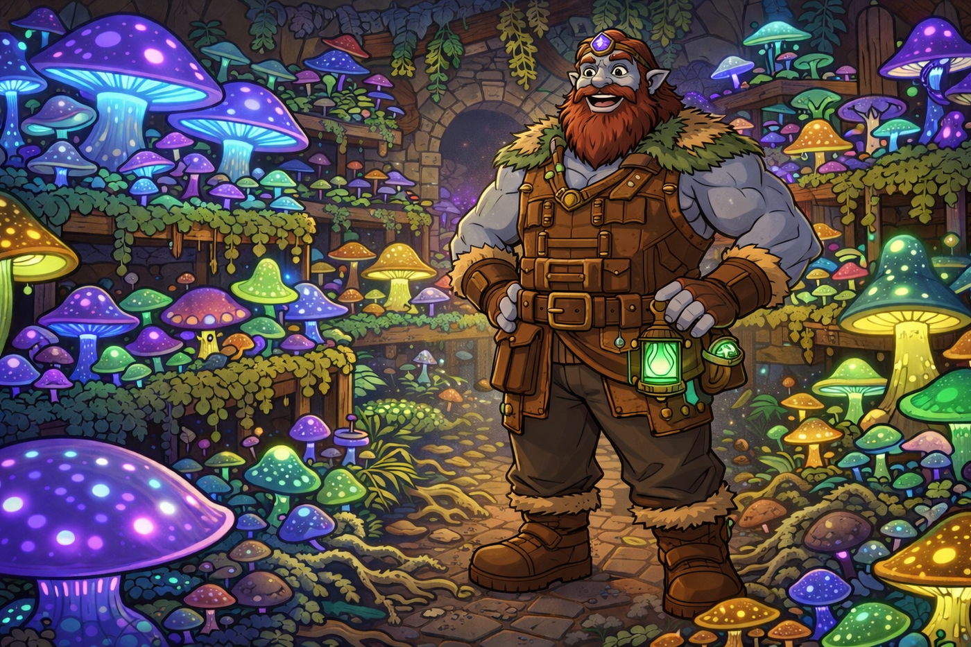 A once-pristine garden has been fully converted into a mushroom cultivation site. Towering shelves of glowing fungi, spore clouds drifting like glittering dust, and thick mycelium crawling over stones and roots. Gemnar proudly stands at the center, hands on hips, as bioluminescent mushrooms illuminate the space in blues, purples, and greens. The scene feels productive but slightly unhinged. Expressive, playful fantasy tone.