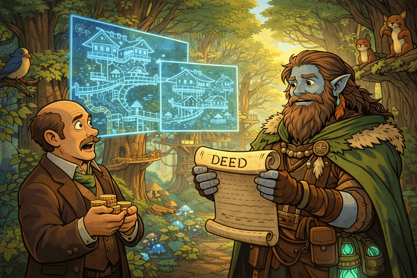 Tovin finalizes the purchase of an adjacent property destined to become a treehouse sanctuary. A nervous real-estate official hands over a deed while massive ancient trees loom overhead. Blueprints float magically in the air, showing layered treehouses, rope bridges, and animal habitats woven into branches. Birds, squirrels, and forest creatures peek in approvingly. Lighthearted, hopeful mood.