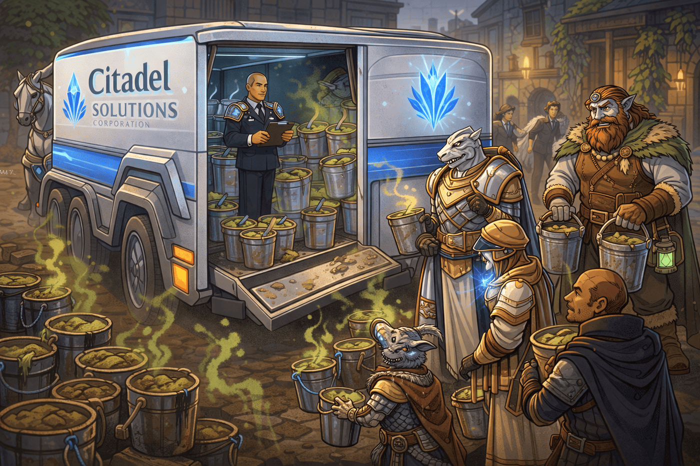 A Citadel Solutions waste wagon is parked at the curb, actively picking up foul-smelling buckets that have been removed from sealed sewer grates. Workers in uniform load the buckets efficiently into the wagon. Greenish fumes curl upward from the buckets, unpleasant and unnatural. All sewer grates are sealed shut with metal plates and glowing ward-runes. No one enters the sewers.