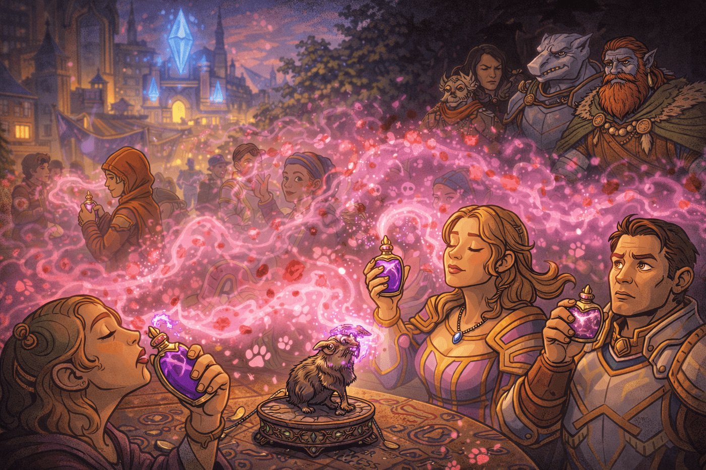 Across the Radiant Citadel, citizens spray and wear elegant perfume bottles that emit shimmering pink mist. Beneath the pleasant glow, faint red infernal particles swirl—helldust dissolved within. Some citizens look relieved; others seem subtly dependent, reaching for more. In the background, the party watches from shadow, alarmed by what they now recognize.