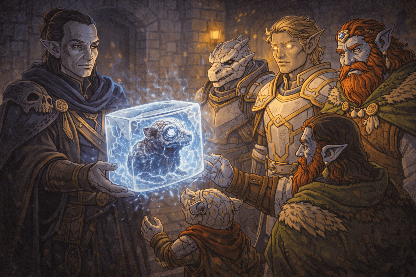Inside a stone chamber of the bastion, Erasmo carefully hands over a frozen cranium rat, preserved inside a clear block of ice. Frost curls off the surface, and the rat’s enlarged skull and faintly glowing brain are visible through the ice. The moment feels clinical, tense, and important. Erasmo stands slightly apart, arms extended as he presents the specimen, his expression serious and professional rather than sinister.