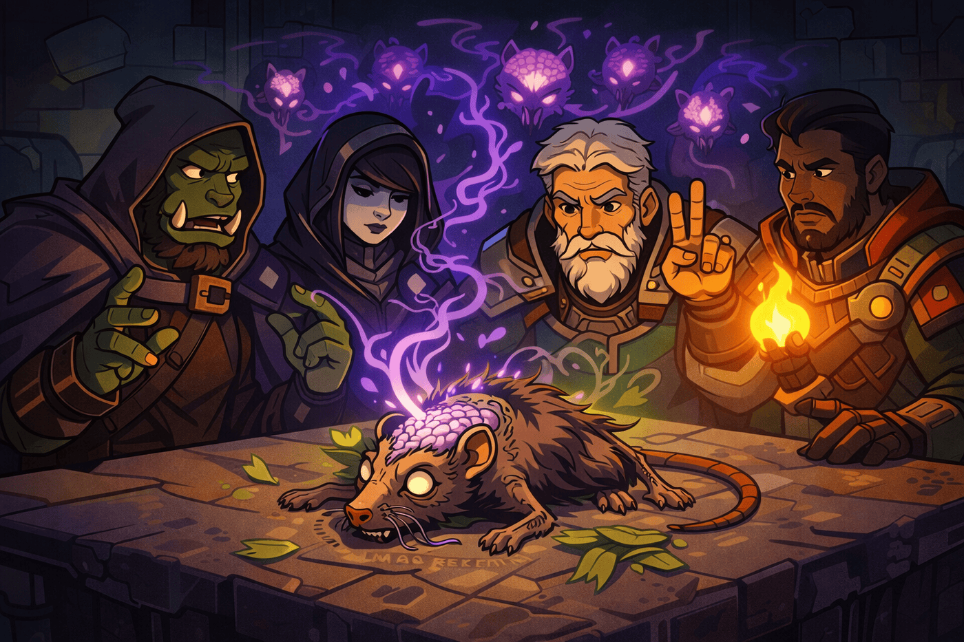 The party gathered around a stone table as a cranium rat corpse twitches under Speak with Dead. Its skull is partially gnawed open, brain exposed and glowing faintly, with ghostly thought-threads connecting to shadowy silhouettes of other rats behind it. One party member raises fingers to count the remaining questions. The mood is eerie, investigative, and unsettling—but still stylized and readable.