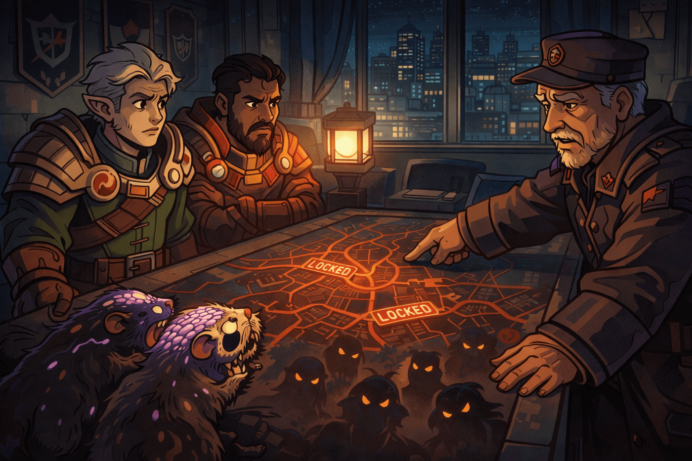 Haru and Toven meet Commissar Lee in a dim Shield Bearers chamber. A large map of the city glows red beneath the streets, sewer lines marked “LOCKED.” Shadowy ghouls lurk beneath the map as faint silhouettes. Lee looks tired, compromised, and wary. Outside the window, city lights glow peacefully—an uneasy contrast to the disaster below.