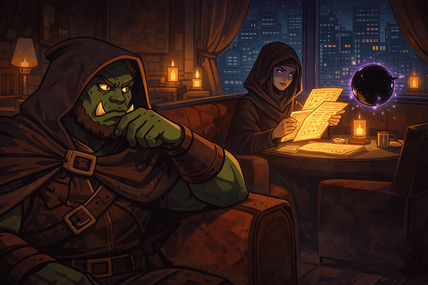 Sundr, disguised as a bulky orc via Alter Self, lounges inside the Second Chance Lounge while secretly watching Adzinka in a black veil reviewing glowing documents. Floating beside her is a small, terrifying void orb—the sphere of annihilation—subtly warping reality. Her expression is calm, brilliant, and stressed. The lighting is warm and lounge-like, hiding very dark secrets.