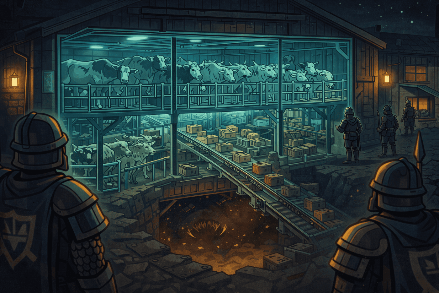 An X-ray-like magical overlay reveals the interior of a massive warehouse: dozens of live cows, goats, and sheep packed into holding pens, with conveyor belts of meat crates feeding downward into darkness. Shield Bearers patrol outside, unaware. Below the floor, something massive and unseen stirs. The tone is absurd, ominous, and darkly funny.