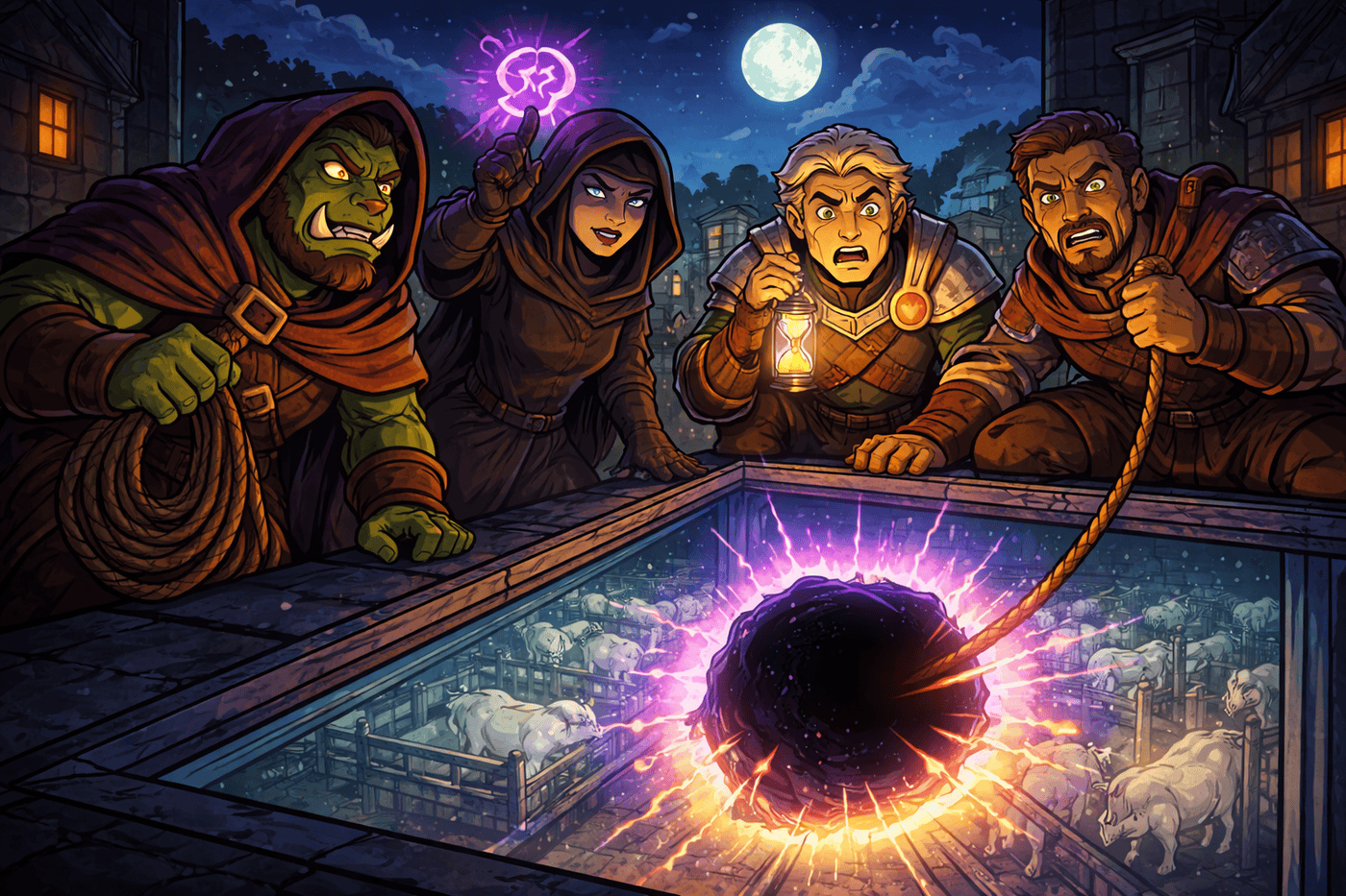 The party crouched on a warehouse rooftop at night, moonlight reflecting off a glass skylight. Below, the sphere of annihilation carves a glowing, reality-tearing entrance into the building as livestock are moved inside. One character checks a timing signal from Adzinka, another grips a rope, another peers nervously down. The mood is tense, ridiculous, and cinematic—this is clearly a terrible plan and everyone knows it.