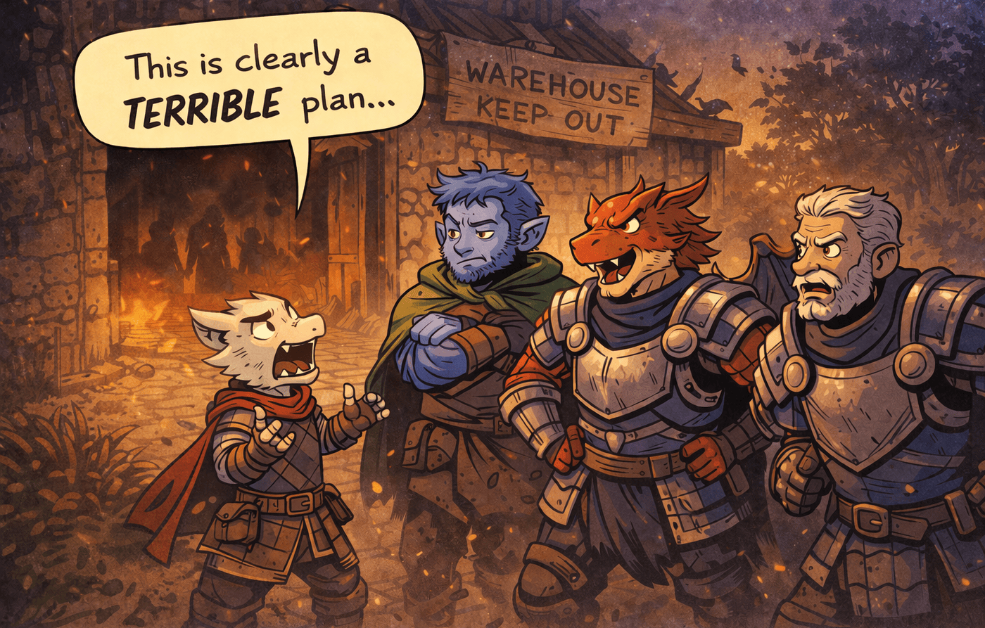 The party crouches in the shadows outside an abandoned warehouse at night. A faint, eerie glow pulses from within as cows are quietly herded toward the building. One character checks the time nervously while another peers through broken boards. Everyone looks tense but committed — this is obviously a bad idea and they all know it. Bold outlines, flat colors, simple shading, cinematic moonlight, playful but ominous mood.