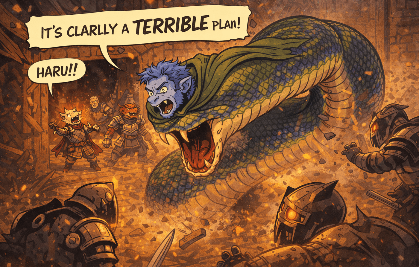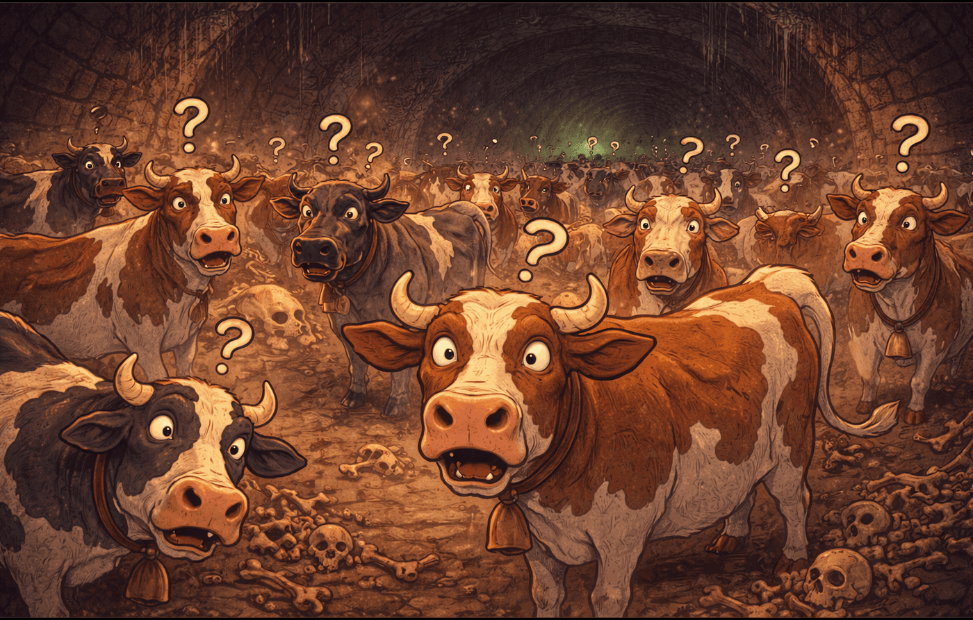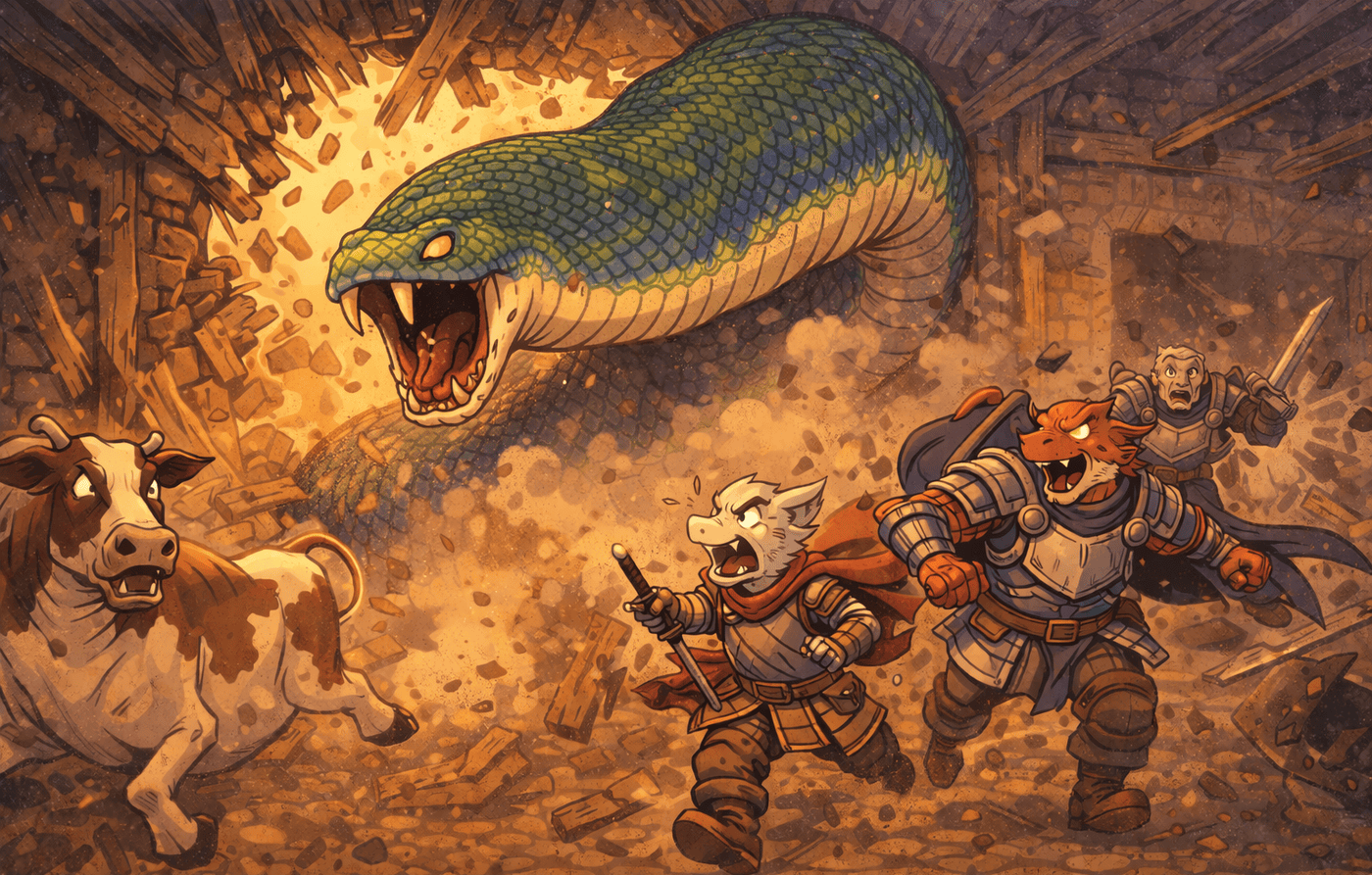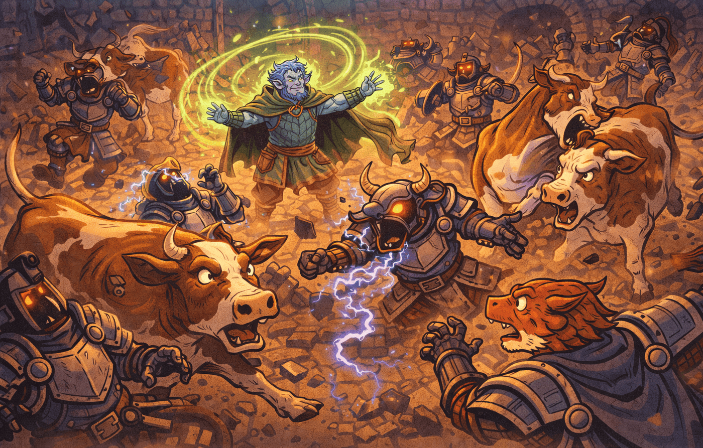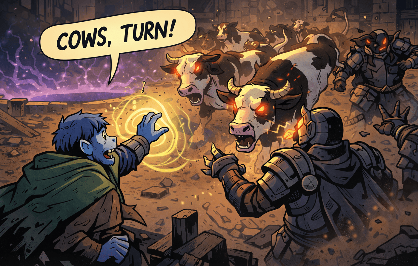 Tovin, calm amid chaos, casts Speak with Animals as cows suddenly turn hostile toward the helmed horrors. Cattle rear, charge, and panic the armored spirits while enemies stumble in confusion. The scene is ridiculous, loud, and triumphant. Bright colors, exaggerated motion, humorous energy without losing tension.