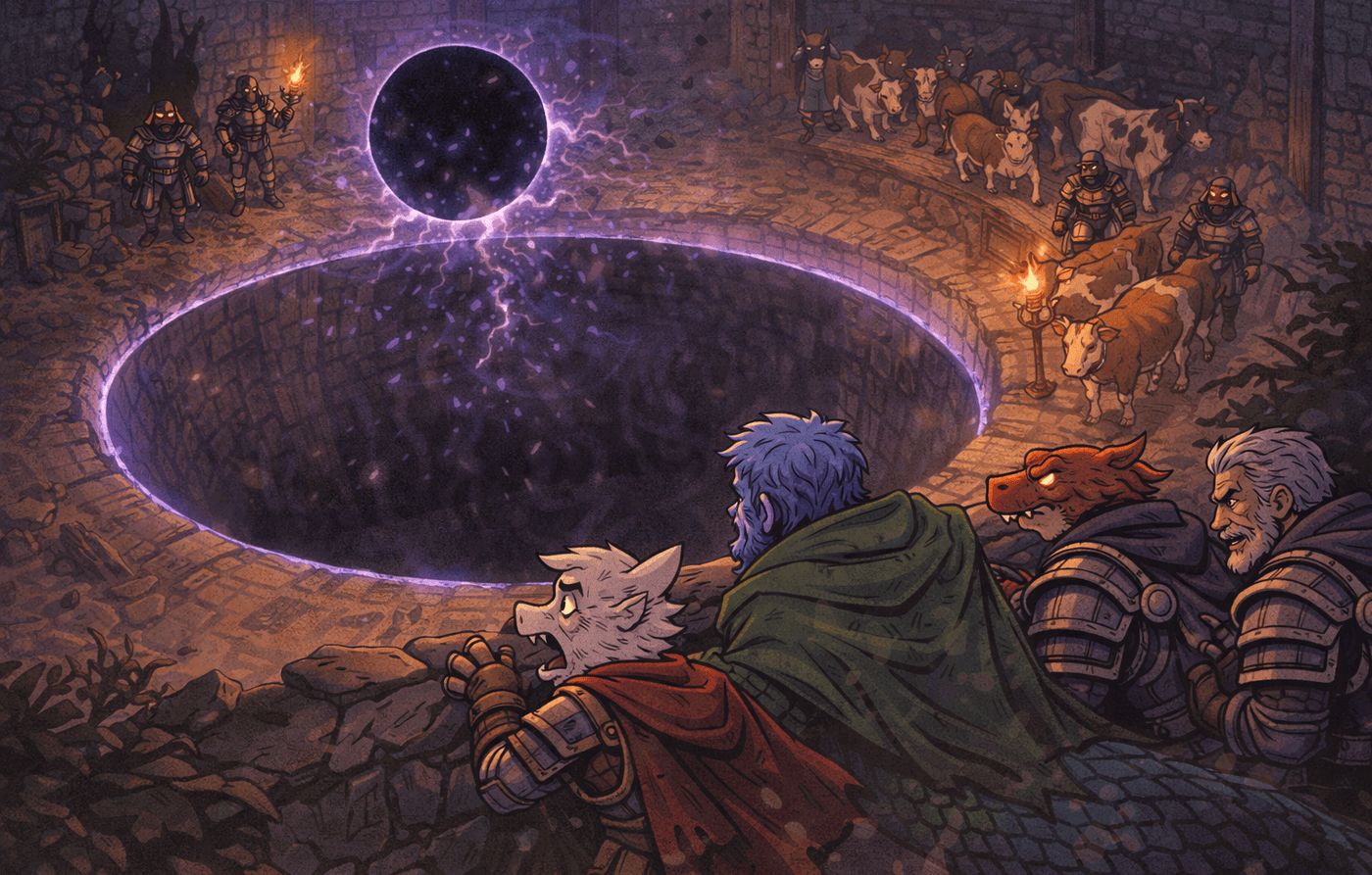 A shocking reveal inside the warehouse: a massive, perfectly circular hole has been carved through the floor, edges glowing faintly with reality-warping energy. A floating sphere of annihilation hums above the opening while armored helmed horrors calmly herd cattle down a spiraling ramp. The party watches from cover, realizing the operation is already underway. Clean shapes, eerie glow, unsettling calm.