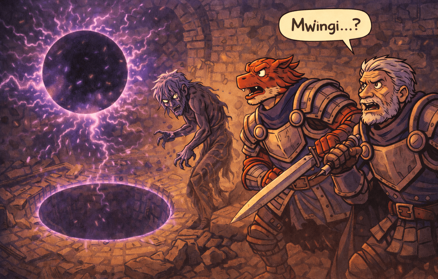 A mysterious humanoid figure stands near the floating sphere, partially silhouetted, bearing an unsettling resemblance to the long-dead Mwingi. Its posture is wrong — hunched, twitchy, and ghoul-like. One character recoils in recognition while another grips their weapon in disbelief. Subtle creepiness, exaggerated expressions, restrained horror tone.