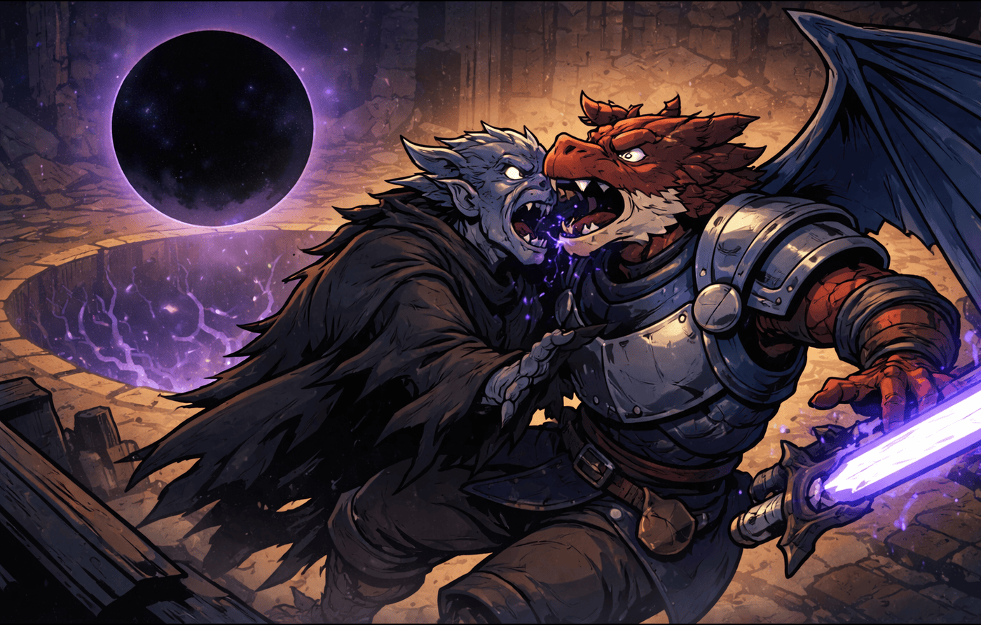 Kiet flies into the air mid-confrontation as the Wingy-like figure lashes out, biting him viciously. Arcane energy crackles as Kiet reels from the hit, pain and shock on his face. The sphere of annihilation drifts menacingly nearby, asserting control over the battlefield. Dynamic composition, bold action silhouettes, bright spell effects.