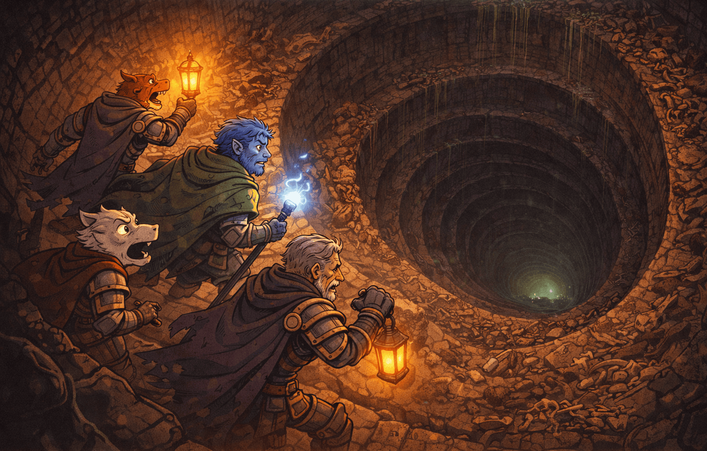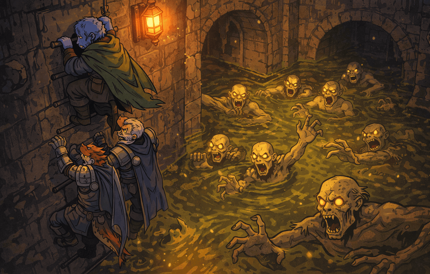 The party descends into deep, unfamiliar sewers beneath the city, following the cattle. The tunnel spirals downward into darkness, walls slick with grime. Below, piles of bones and butchered remains hint at something far worse. Lantern light and spell glow illuminate horrified faces. Moody but readable, spooky adventure tone.