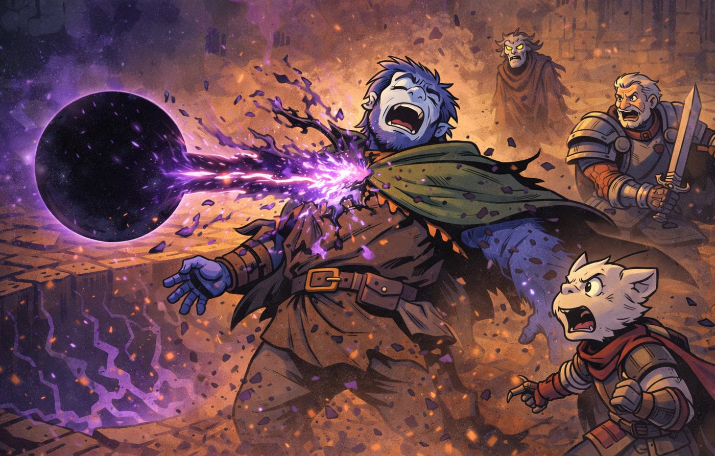 The sphere of annihilation lunges sideways, clipping Tovin with a devastating arc of void energy. Tovin is thrown back mid-motion, limbs flailing, as the party shouts in alarm. Reality seems to tear slightly around the sphere. High contrast lighting, dramatic impact frame, frozen-moment intensity.