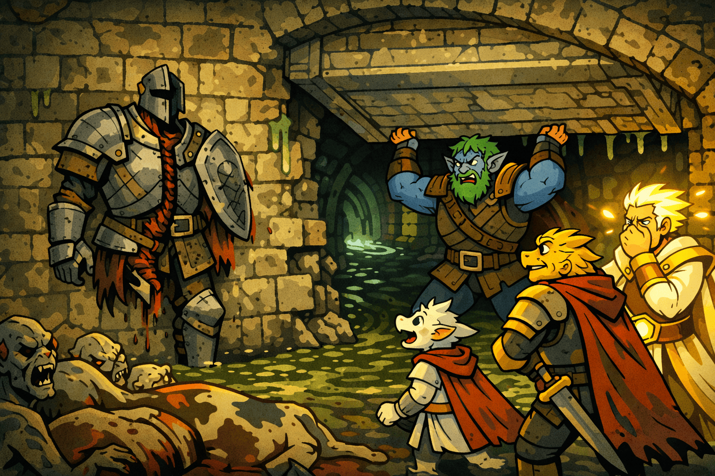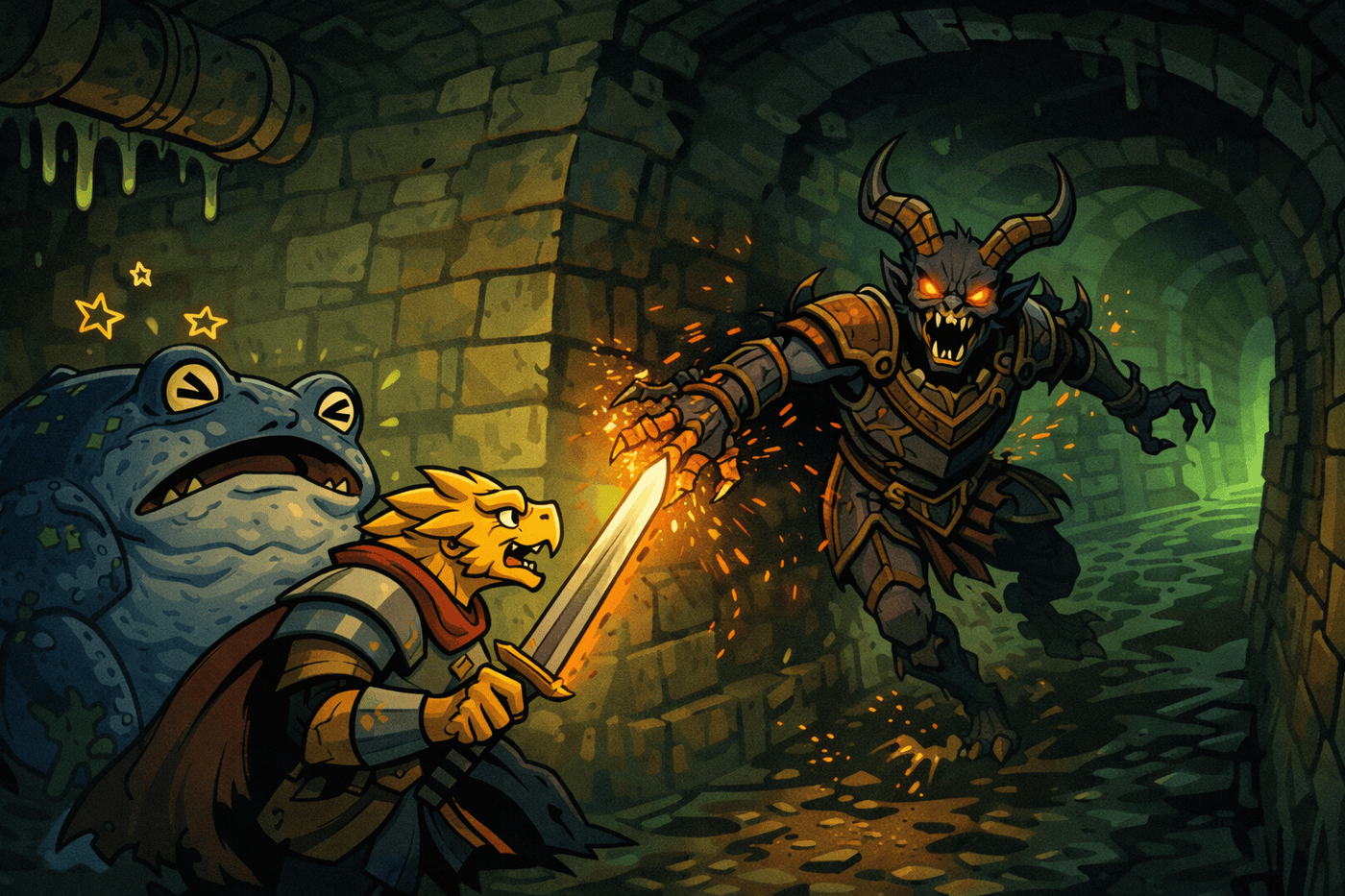 The creature that wore Mwingi’s form has transformed into a twisted demonic shape with elongated limbs and cracked armor. It scuttles around a sewer bend, grinding sparks flying. Kiet the golden dragonborn lunges forward in an opportunity attack, sword trailing embers. Behind him: stunned toad-Tovan wobbling with cartoon stars around his head from paralysis.