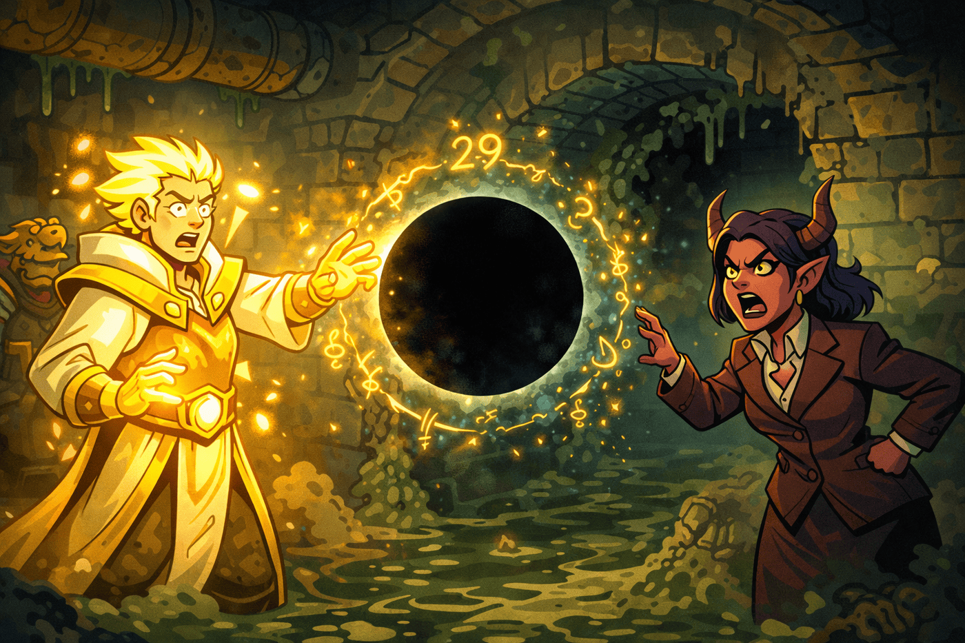 The Sphere of Annihilation floats midair — perfect black void devouring sewage as it passes. Sundr, radiant aasimar, stands glowing gold-white, arm extended in divine arcane command. Magical glyphs swirl around him, subtly forming the number “29.” Across from him, Adzinka gestures indignantly, arguing about ownership. The sphere slowly erases part of the sewer wall behind them.