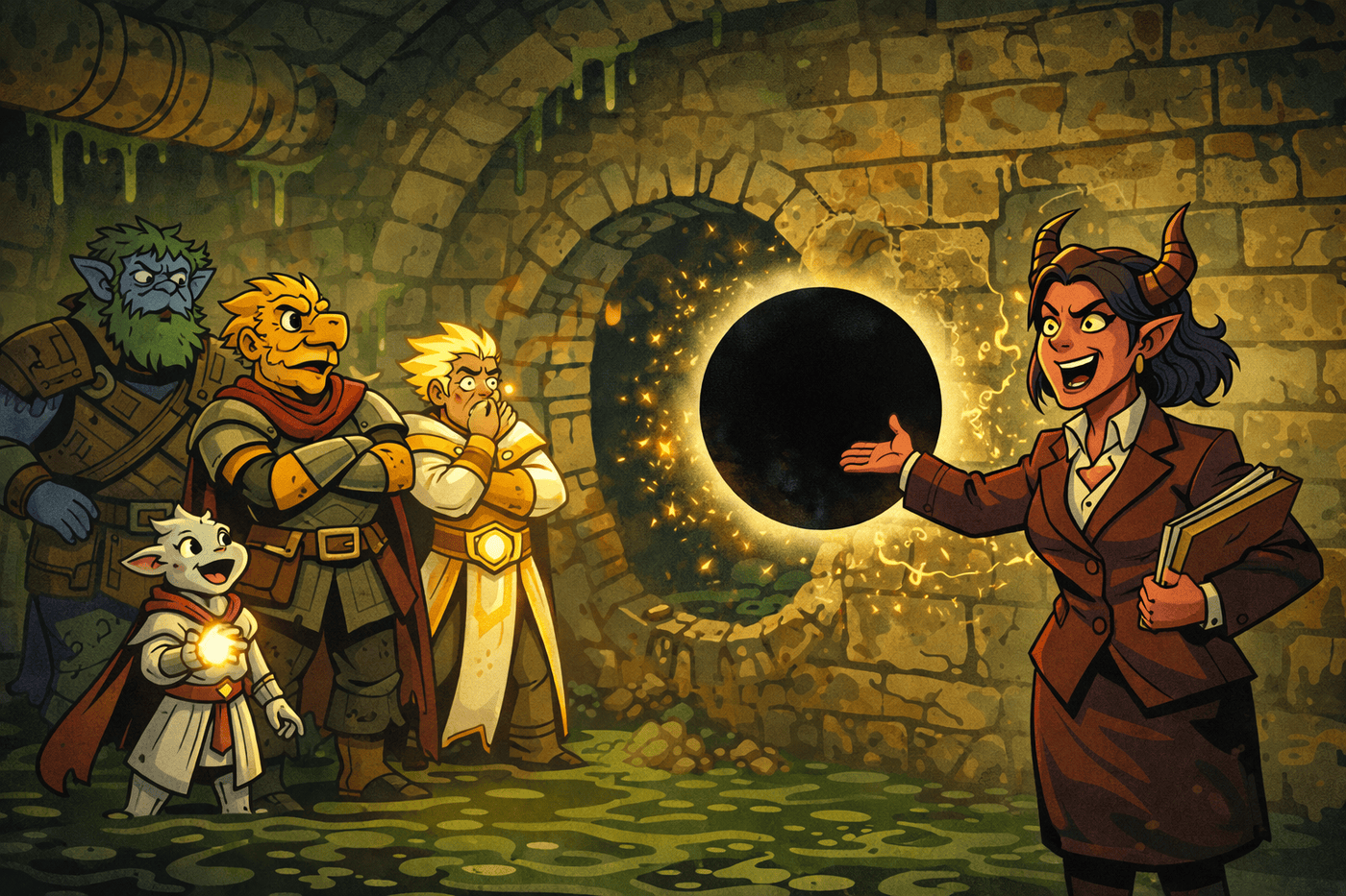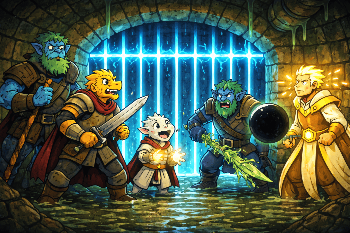 A magical portcullis slams down behind the party, humming with blue arcane energy. The party stands trapped in narrow sewer corridor. Dripping water. Echoes of distant cows. Kiet’s golden scales reflect the arcane glow. The Sphere floats ominously beside Sundr.