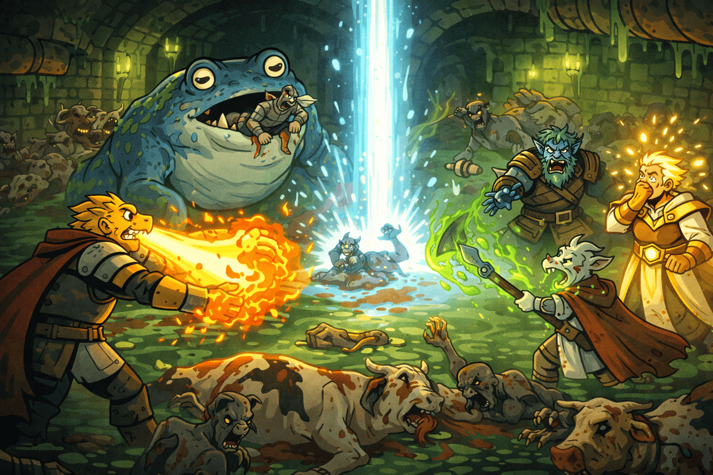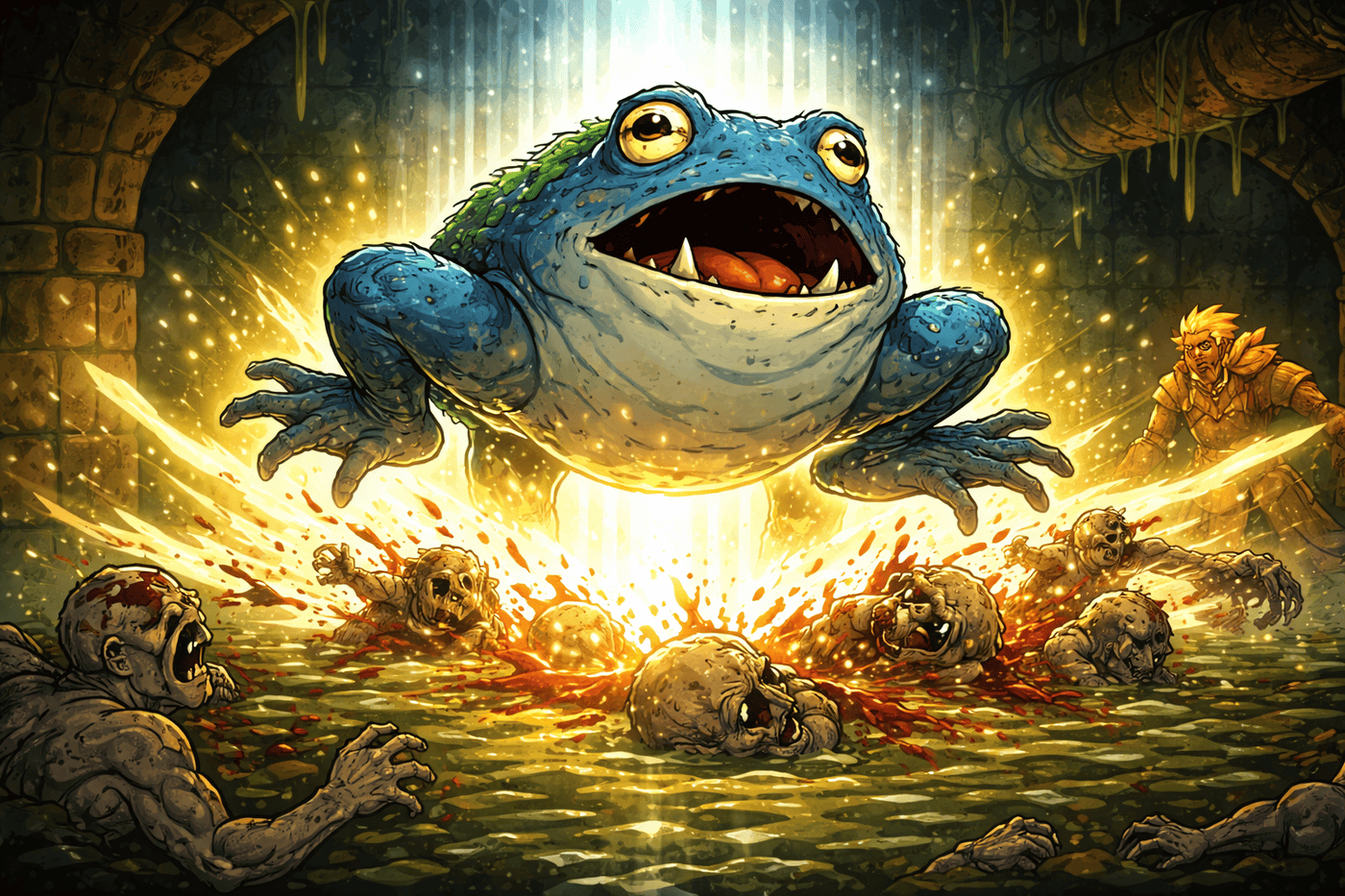Bathed in searing divine light, Tovan’s gargantuan toad form descends like a holy meteor into the sewer feeding chamber. Radiance explodes outward on impact, blasting ghouls off their feet as corrupted flesh recoils from the brilliance. Slime and sewer water erupt in a golden shockwave, undead forms disintegrating beneath the weight of moon-blessed fury. In the background, Kiet’s golden scales catch the reflected light, witnessing the moment a druid weaponizes gravity itself.
