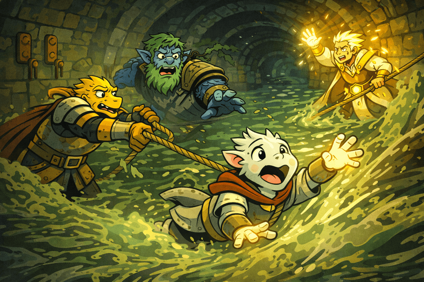 A rushing sewage channel sweeps through a narrow tunnel. Haru, tiny platinum kobold, is being carried 20 feet downstream, glowing faintly while flailing. Kiet, braced against wall, reaches forward. Tovan mid-transformation, half-animal. Sundr illuminates the tunnel with radiant light. Virgil anchors himself with glaive.