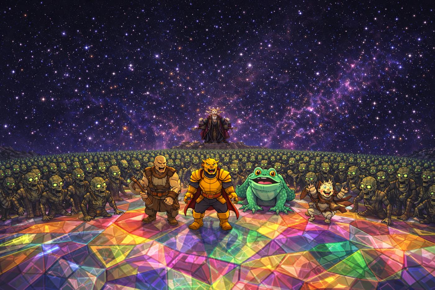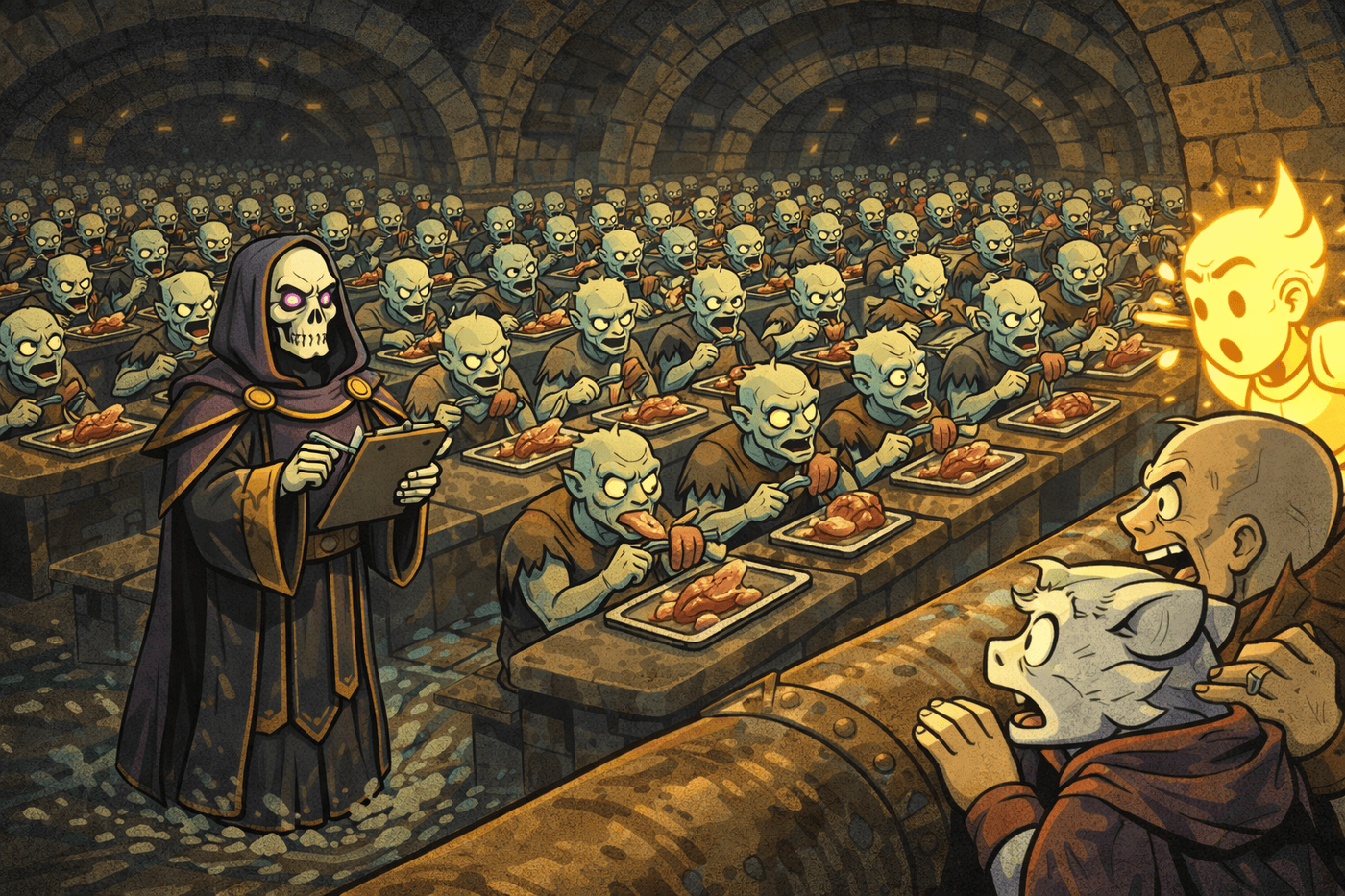 Wide cinematic reveal. Beneath Radiant Citadel’s glowing crystal foundations lies an enormous cavern packed with hundreds of ghouls feasting on cow carcasses. Crimson Rasp banners hang from sewer pillars. Nakorazon stands on a raised platform overseeing the army. In the foreground, the party crouches in shadow, staring in horror at the scale of the invasion. Radiant Citadel’s glowing light faintly visible above through drainage grates.