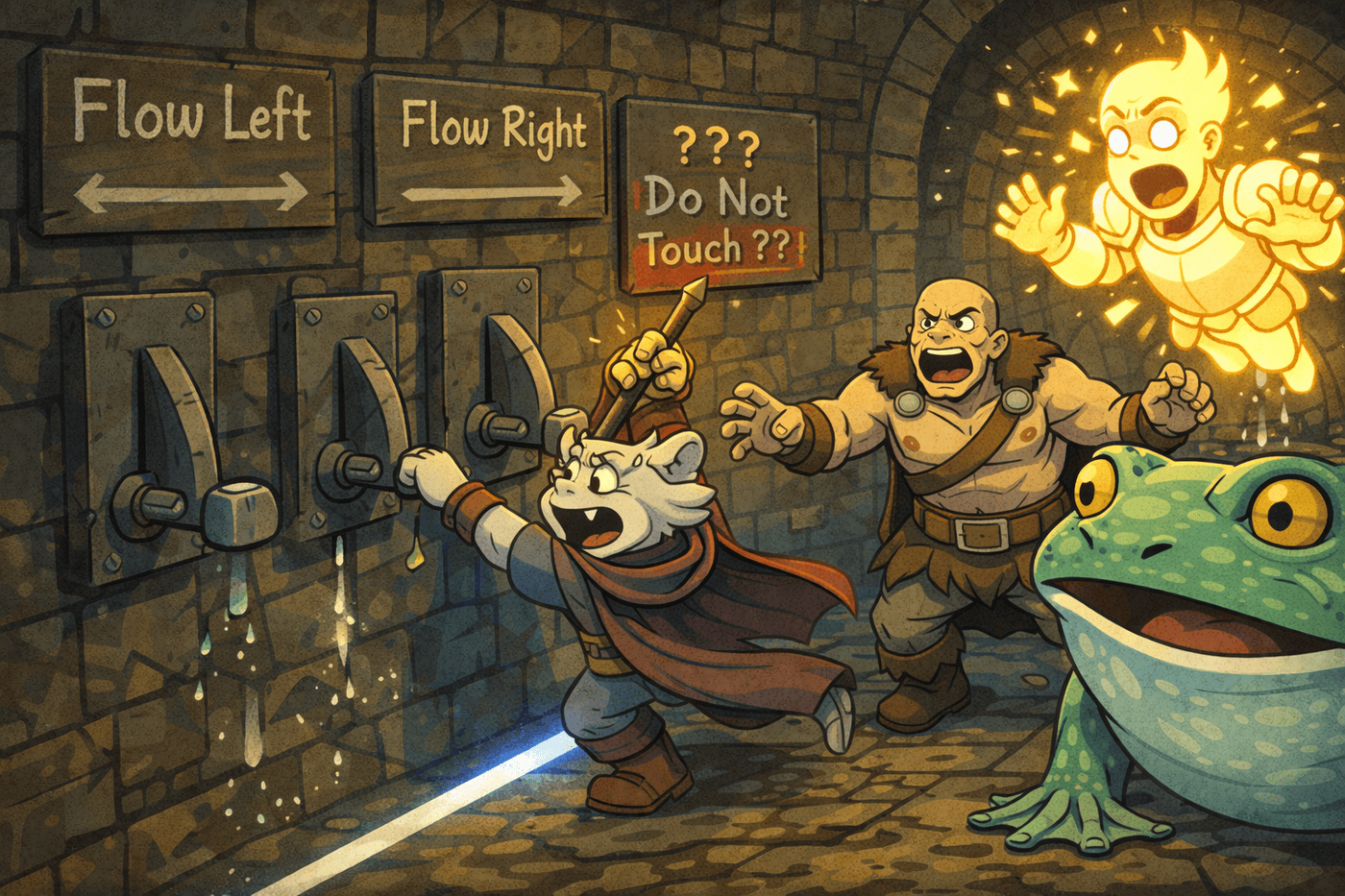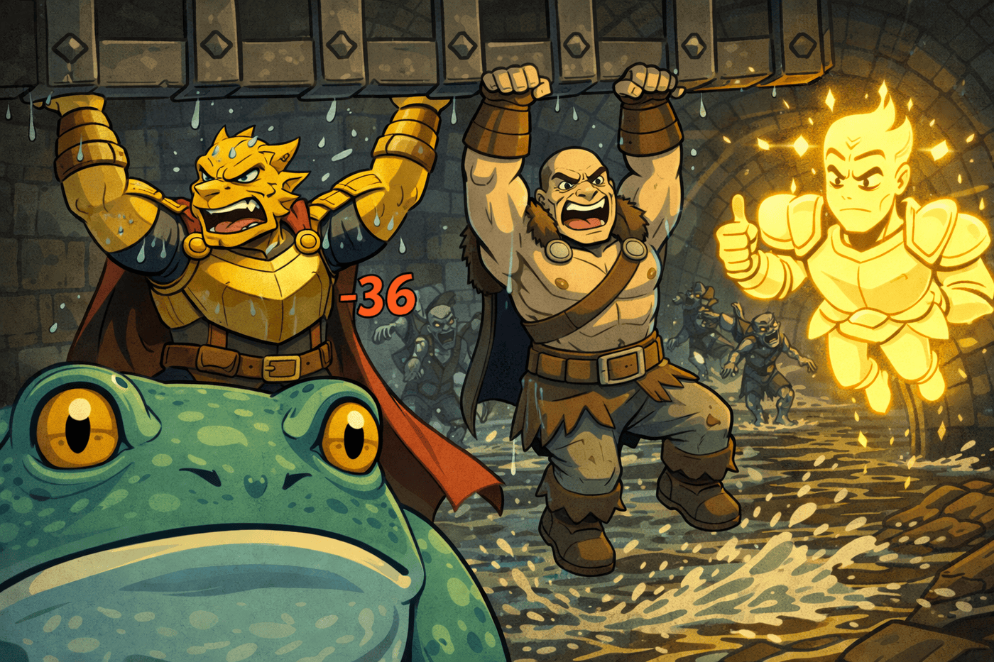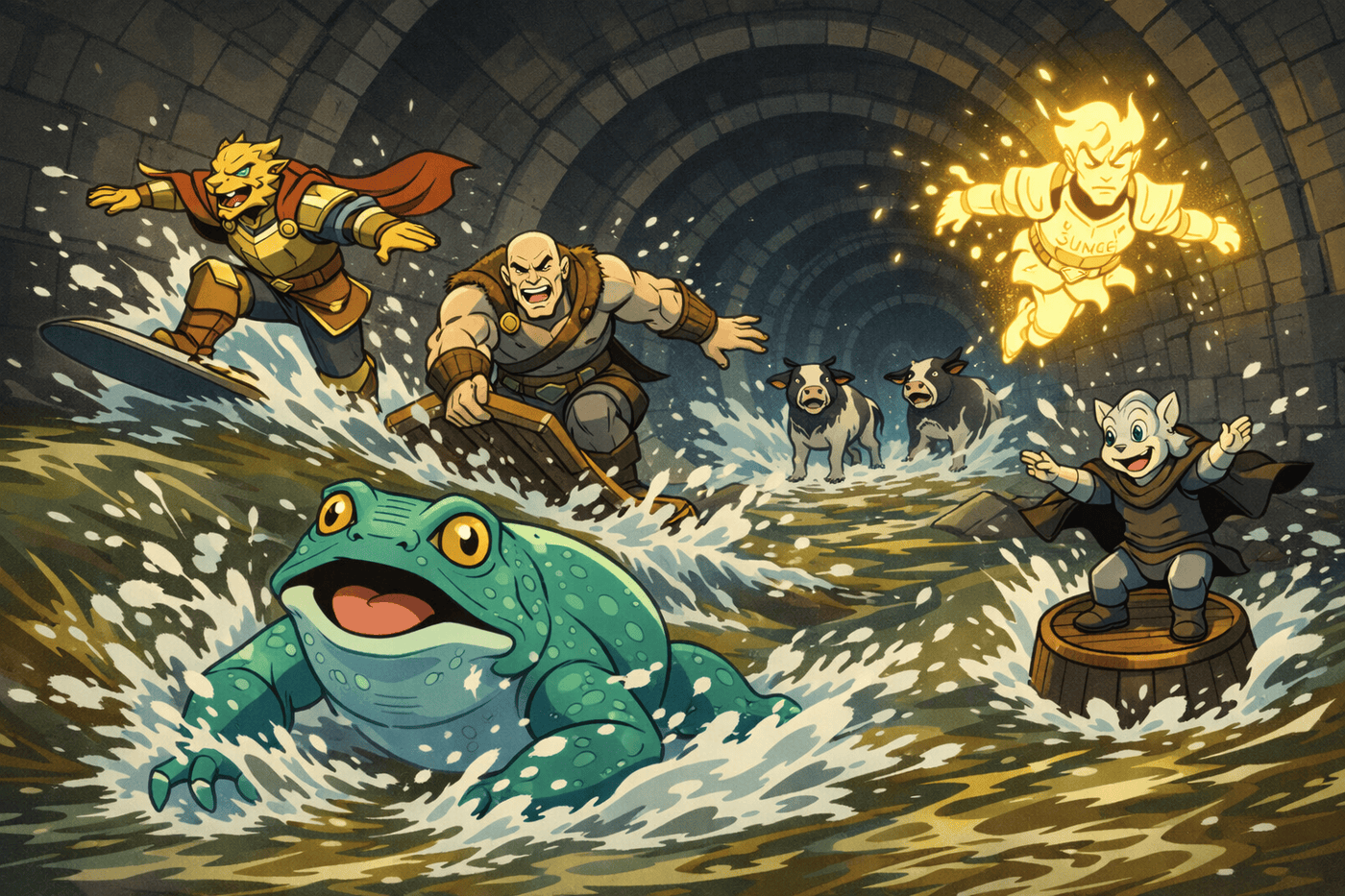 The party surfs down a roaring sewage current in ridiculous improvised ways: