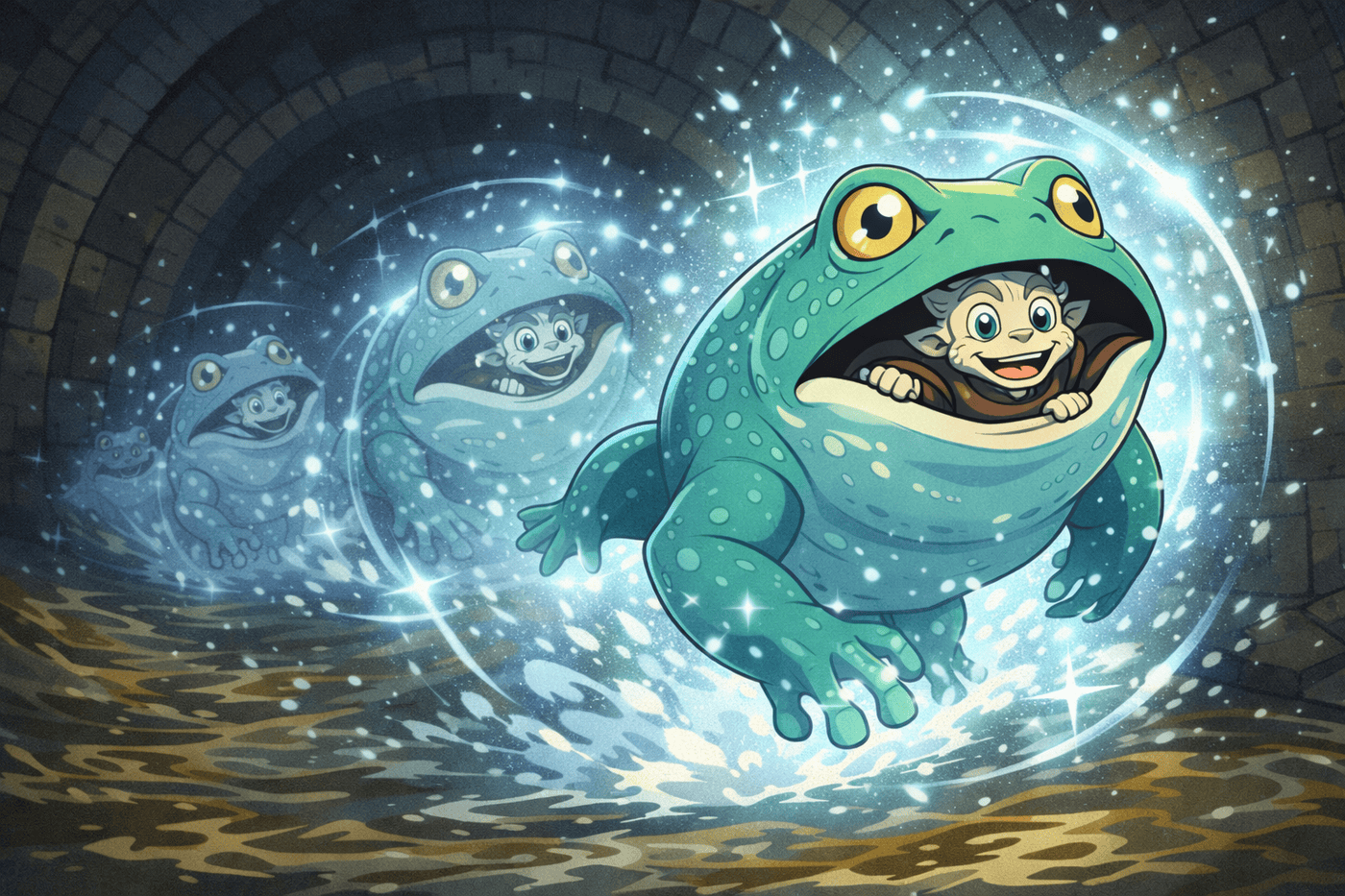 Tovin in giant moon-empowered toad form, glowing faintly with moonlight, holds Haru gently in his wide mouth (Haru visible and calm). The toad blinks in a flash of silver light — mid-Moonlight Step teleport — leaving sparkling afterimages behind. Sewer walls blur around them. Playful but epic magical vibe.