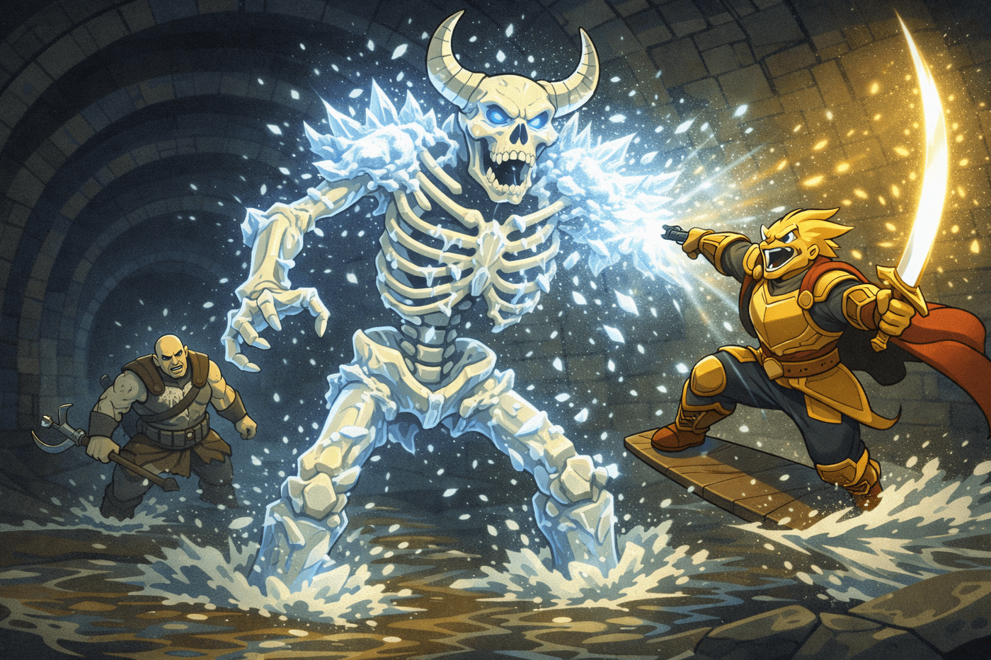 A massive skeletal minotaur blocks the tunnel ahead. Sundr hovers forward, hands raised, blasting radiant frost that encases the skeleton in shimmering golden ice. Kiet leaps mid-air with a glowing weapon, about to shatter it. Gemnar braces behind. The skeleton cracks dramatically. Bright magical glow against dark sewer stone.