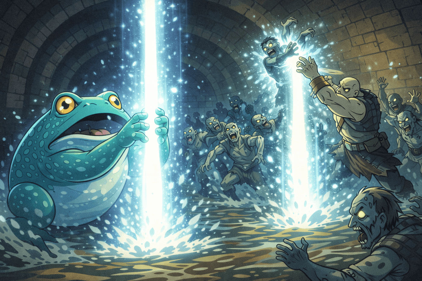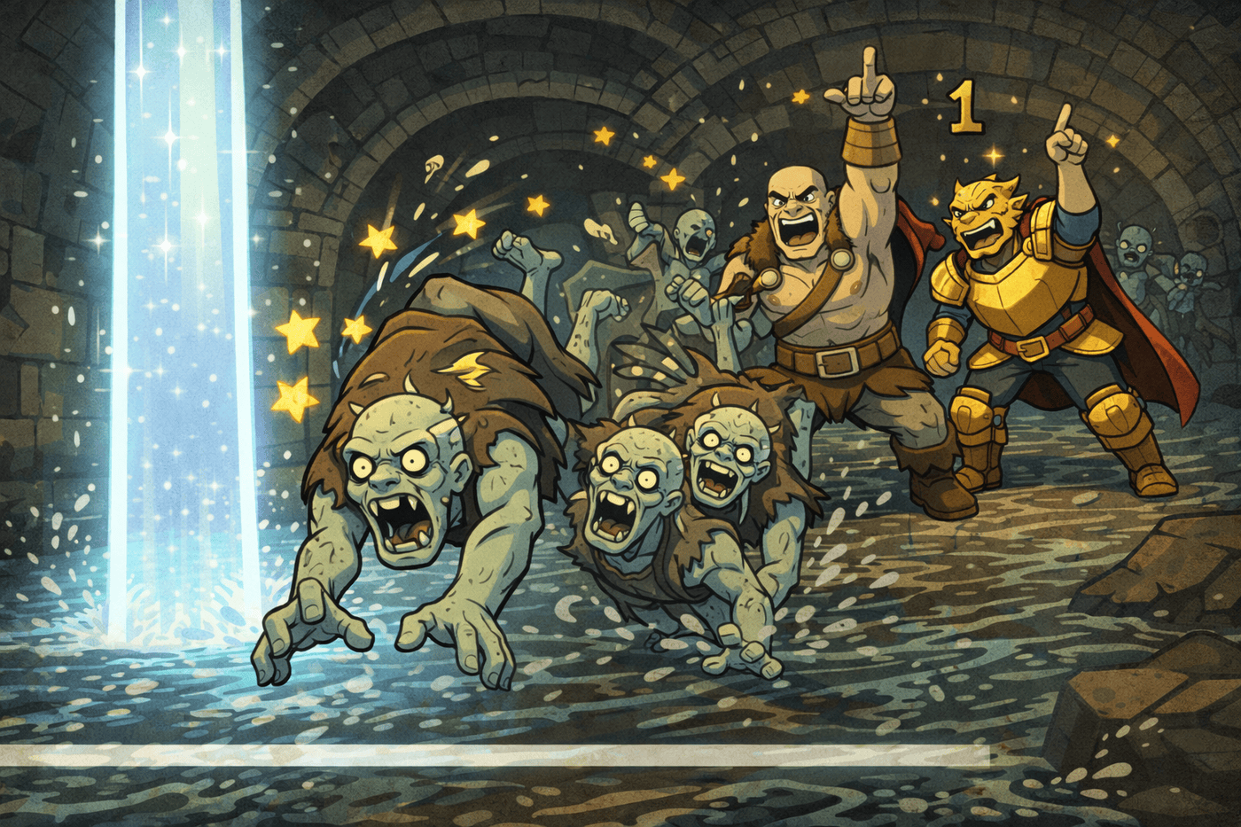 Dozens of ghouls charge through narrow sewer corridors — and straight into a brilliant vertical column of moonlight. Tovin (back in firbolg form) concentrates intensely, staff raised. Gemnar physically throws a ghoul into the beam. Ghouls recoil and smoke under radiant light. Tactical teamwork, dynamic motion.