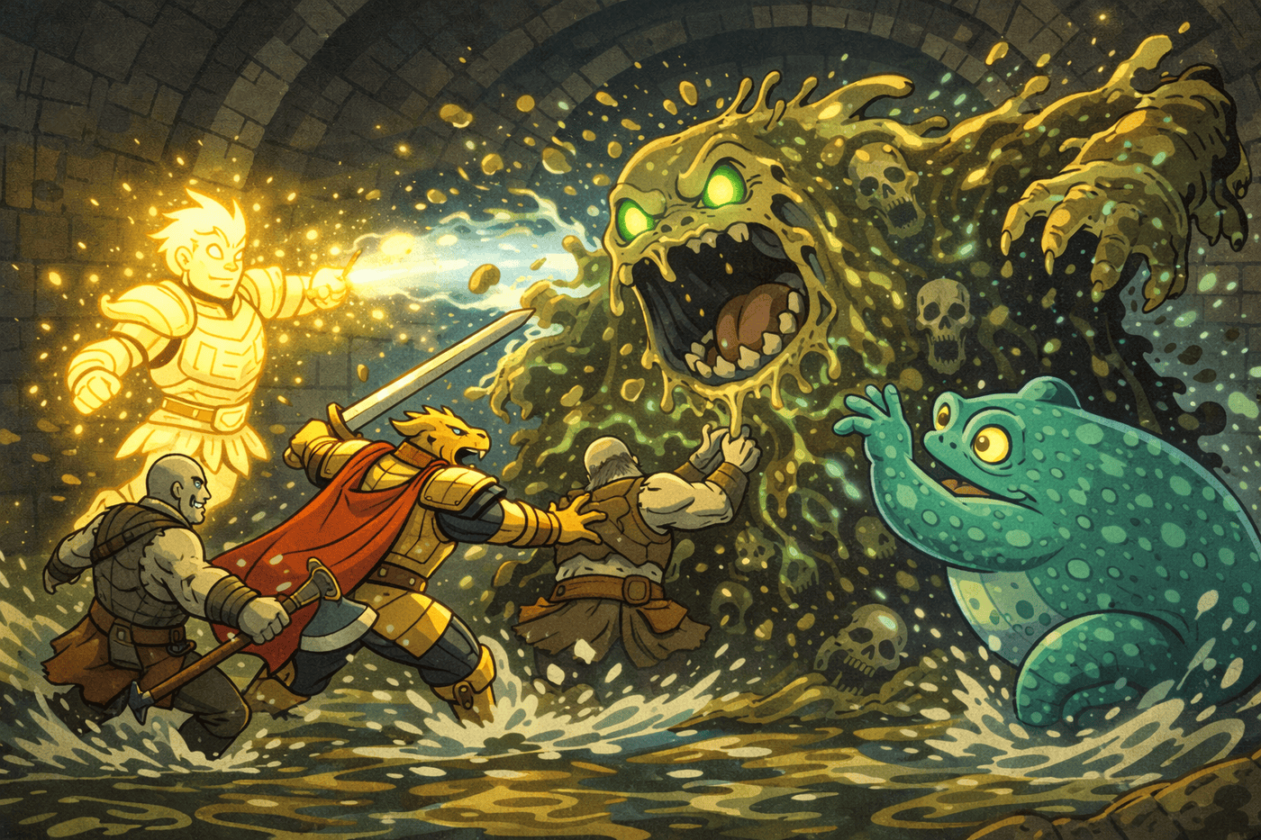 A towering necrotic sludge elemental rises from the sewage — dripping, skeletal shapes half-visible inside it. Eyes glow sickly green. The party surrounds it: