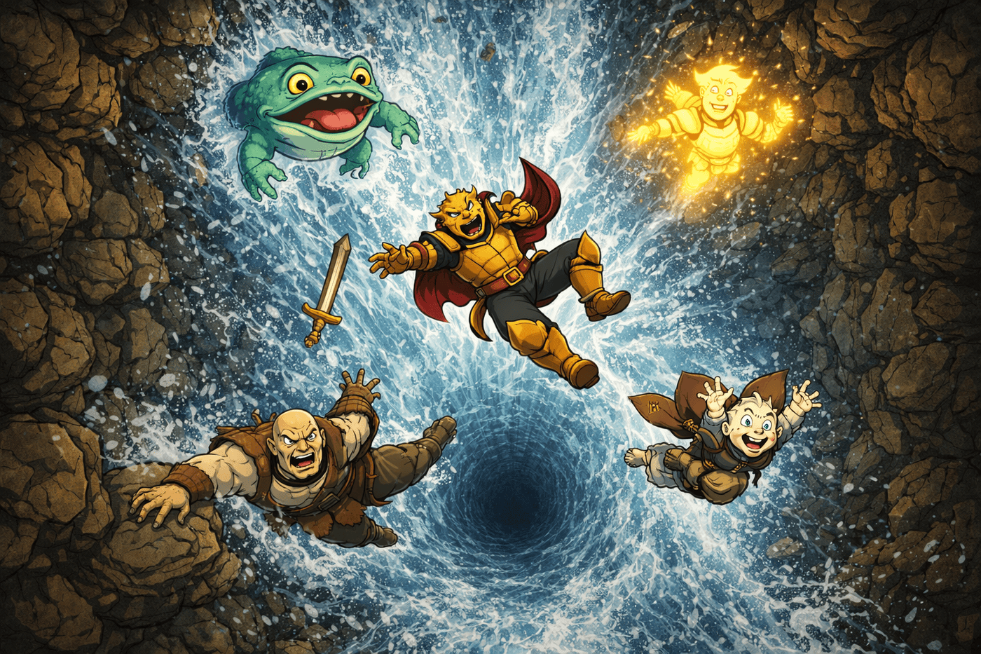 The party leaps together down a massive vertical drain shaft — falling past pipes and runoff channels — glowing moonlight and radiant energy lighting their descent. Below: shadowy shapes of ghouls gathering. Dynamic falling poses, cinematic cliffhanger angle from below looking up.