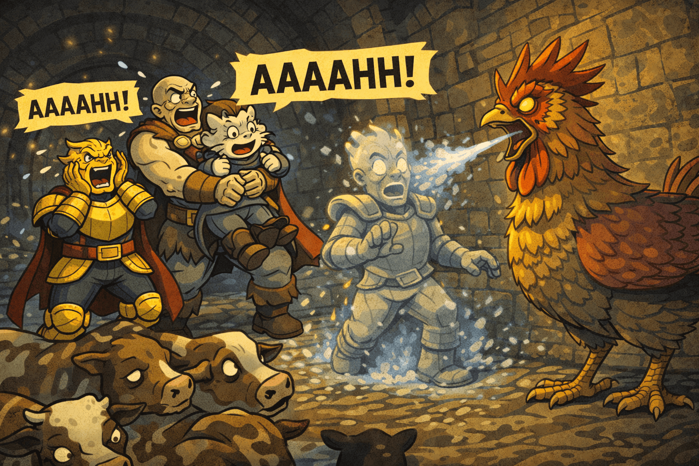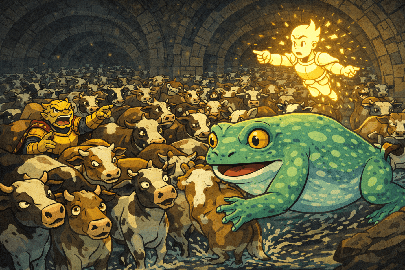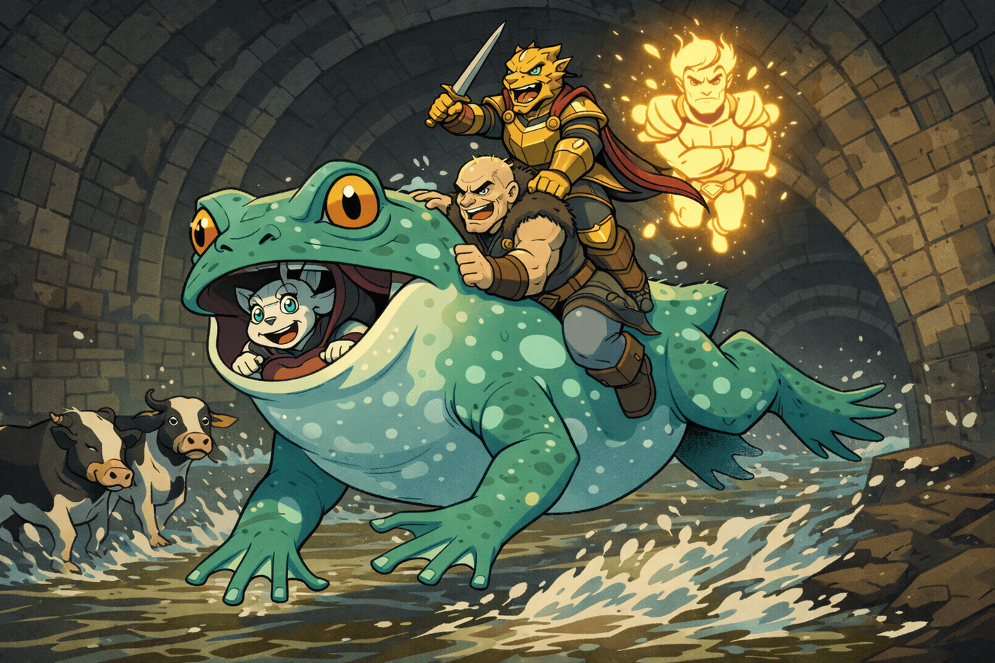 Cows splash past in panic. Exaggerated speed lines and chaotic cartoon fun.