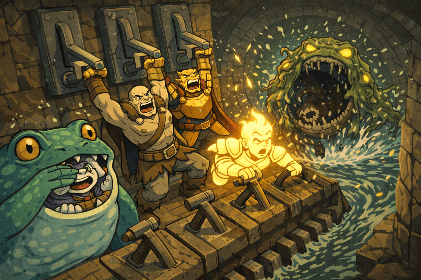 The sludge elemental is being shoved toward a massive circular sewer grinding mechanism — giant rotating stone teeth beneath rushing water. Three large lever switches line the wall. Kiet strains while holding a portcullis open (clearly injured), Gemnar shoulder-checks the elemental, Sundr blasts radiant energy into it, Tovin pushes with wild shape strength. Dramatic industrial fantasy scene.