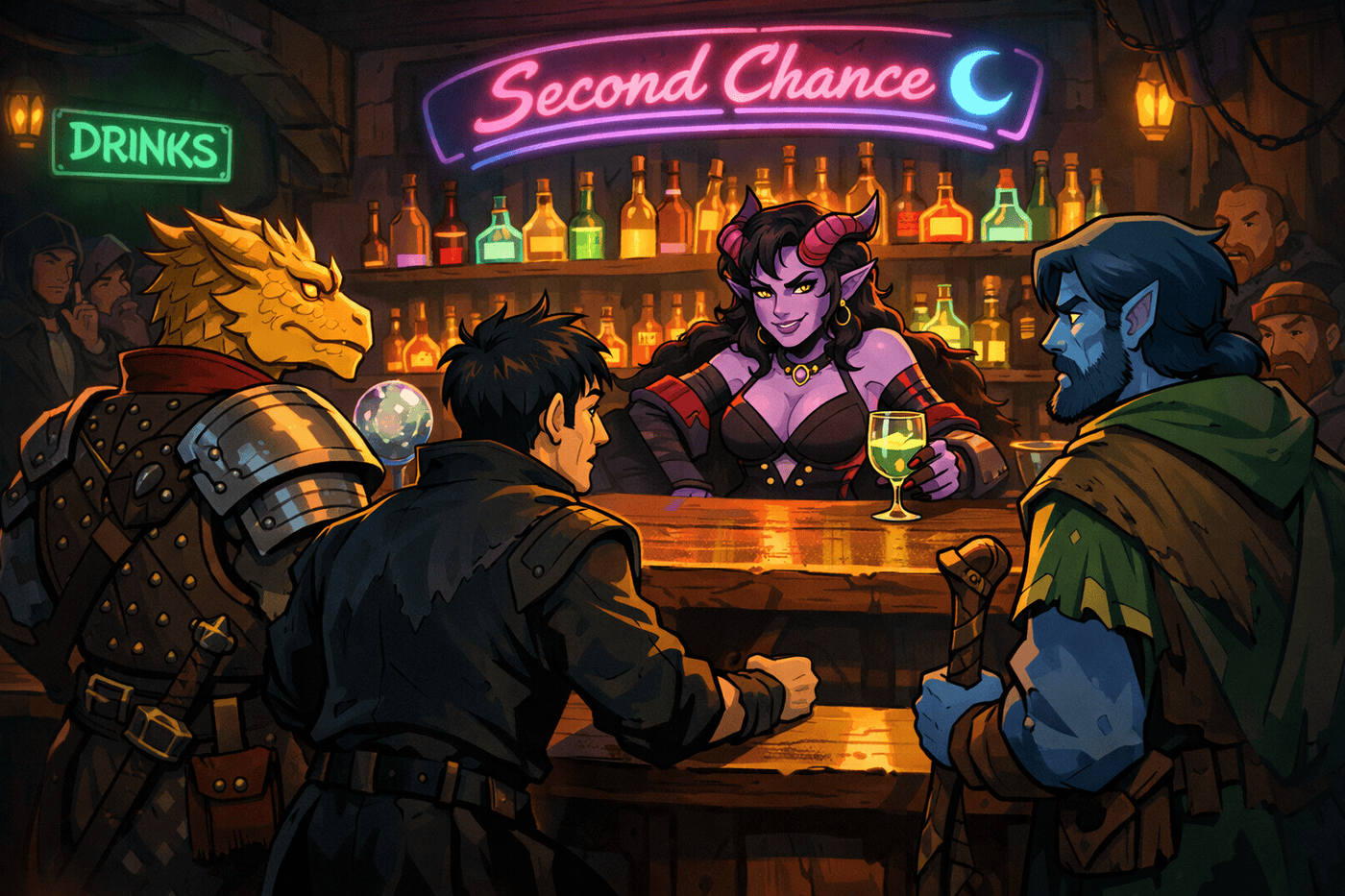 Inside a dimly lit, slightly sleazy lounge, Adzinka lounges confidently behind a bar glowing with magical bottles. Kiet (golden dragonborn), Virgil (tense and aggressive), and Toven (calm firbolg druid) stand across from her. The mood is tense—everyone knows this could go bad. Neon arcane signage flickers. Background patrons quietly panic.
