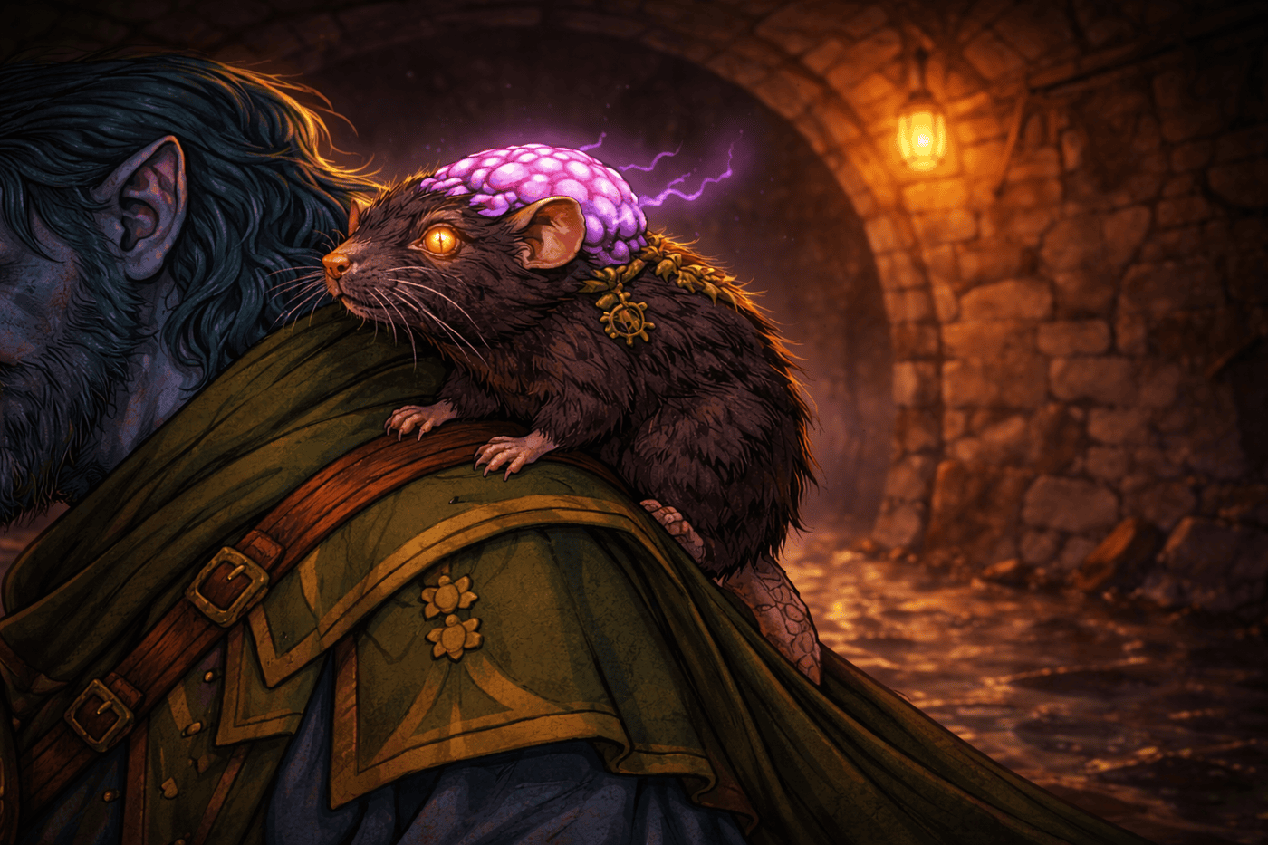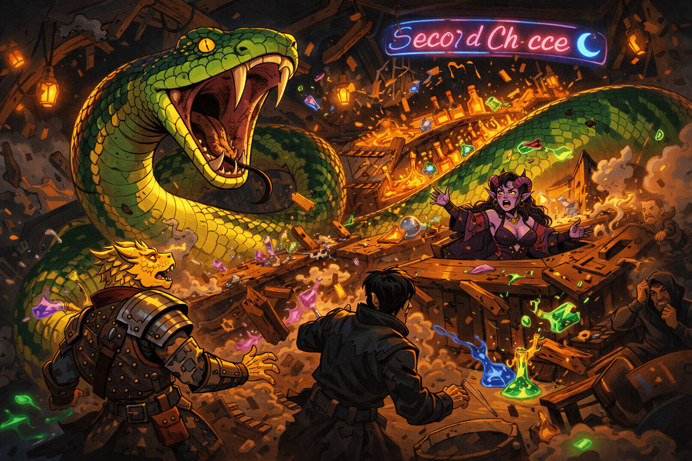 Toven as a large, patterned snake slithers along the rafters or bar shelves, watching Adzinka from above. Below, the negotiation continues, unaware. Dramatic shadows, greenish sewer light bleeding in through cracks. Suspenseful, stealth-focused composition.