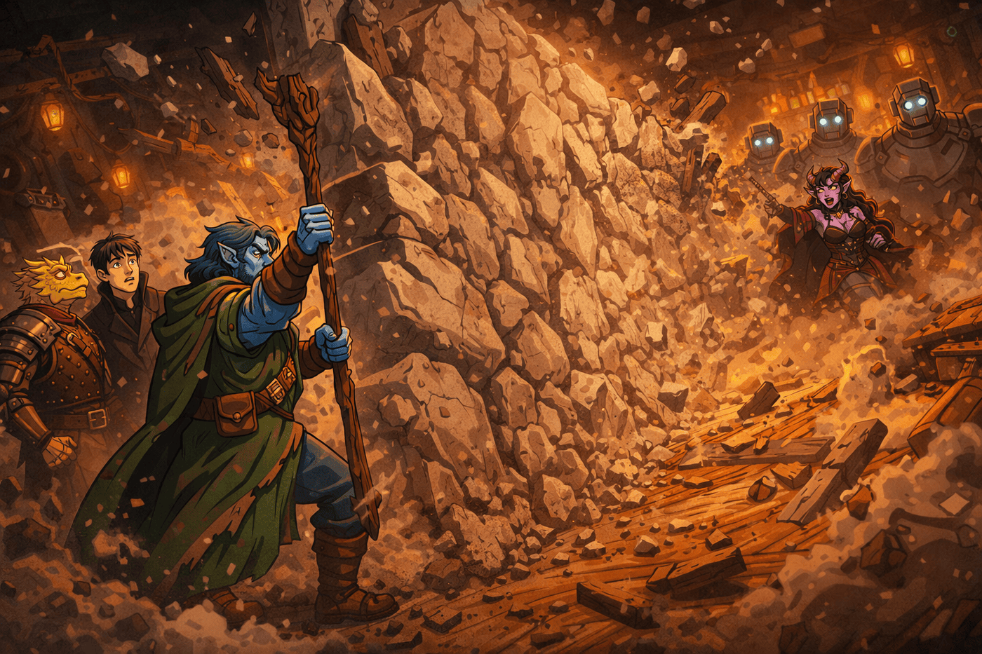 Toven, back in druid form, slams his staff down as a massive stone wall erupts from the ground, splitting the battlefield in half. One side: confused enemies mid-attack. Other side: the party, suddenly safe. Dust, debris, and a sense of “fight over.”