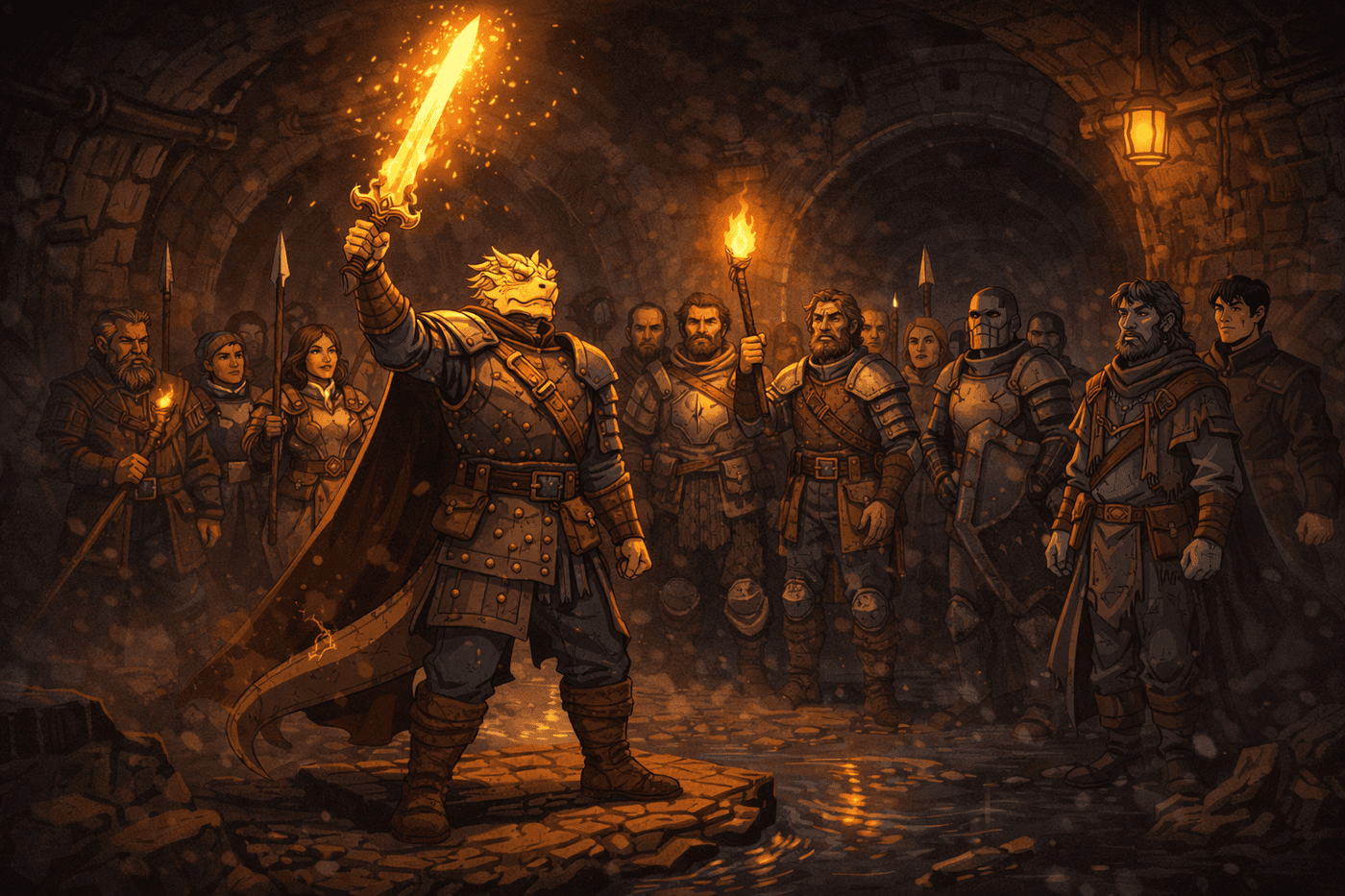 Kiet, now more authoritative, stands before a small force of Shield Bearers in mismatched armor. He holds the glowing sword aloft. The group looks underprepared but inspired. Sewer tunnels behind them hint at the threat below.
