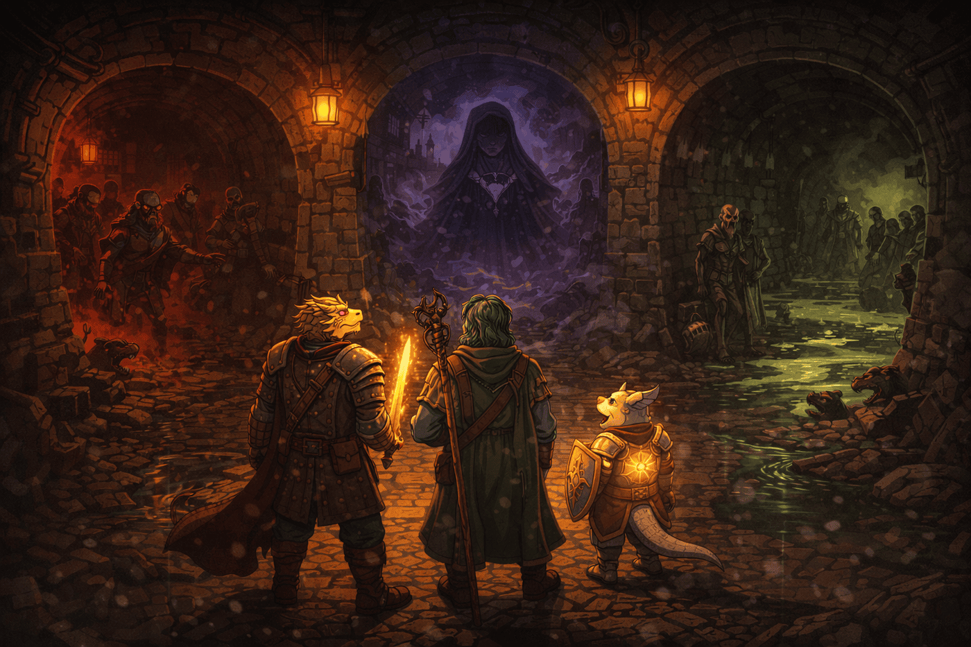 The party stands before three glowing portals or symbolic pathways: A fiery, stormy realm (God’s Breath) A vast arcane library (Yanido) A dark, lifeless wasteland (Bloodspur) They face forward, deciding. Tension and anticipation.