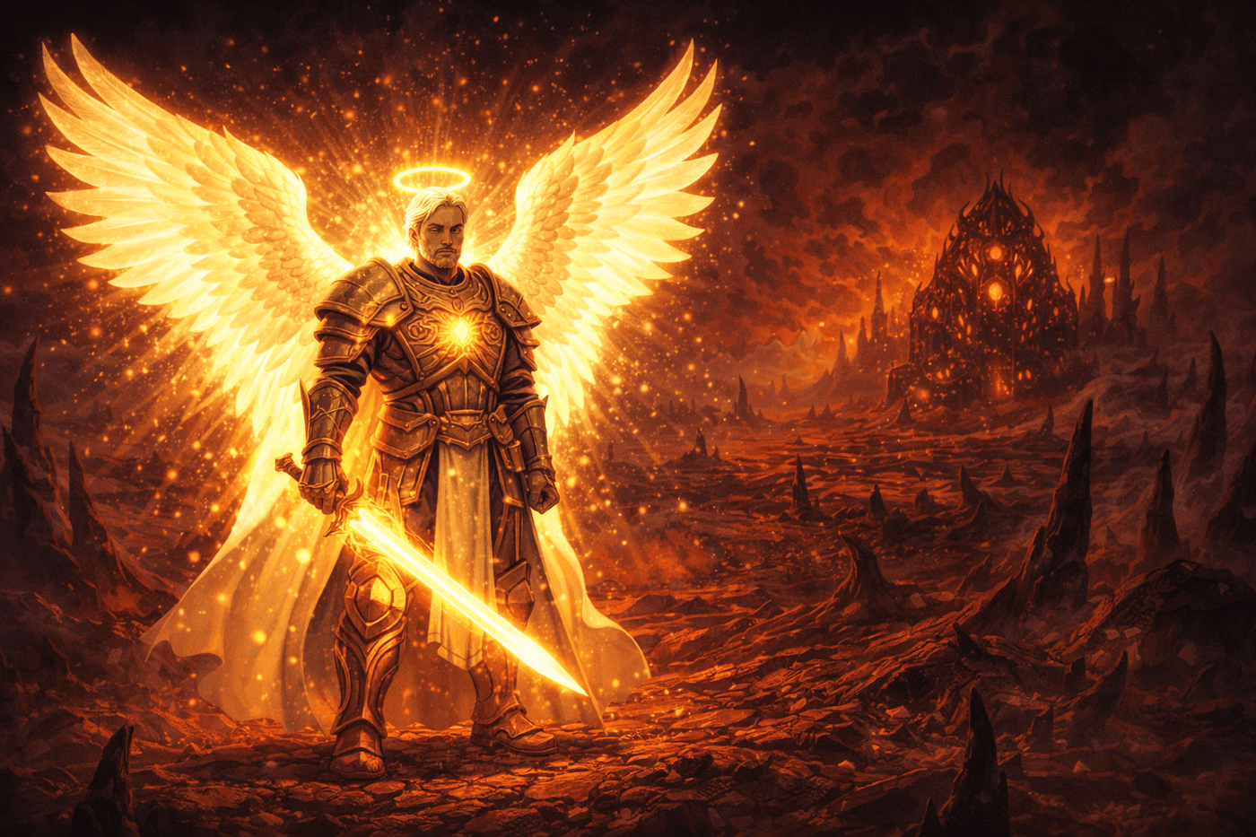 Sundr stands bathed in radiant light as the world around him dissolves into a barren, red-black wasteland—Bloodspur. No sun in the sky. Strange, organic terrain. A faint, distant hive-like structure pulses ominously. Divine light contrasts with oppressive darkness.
