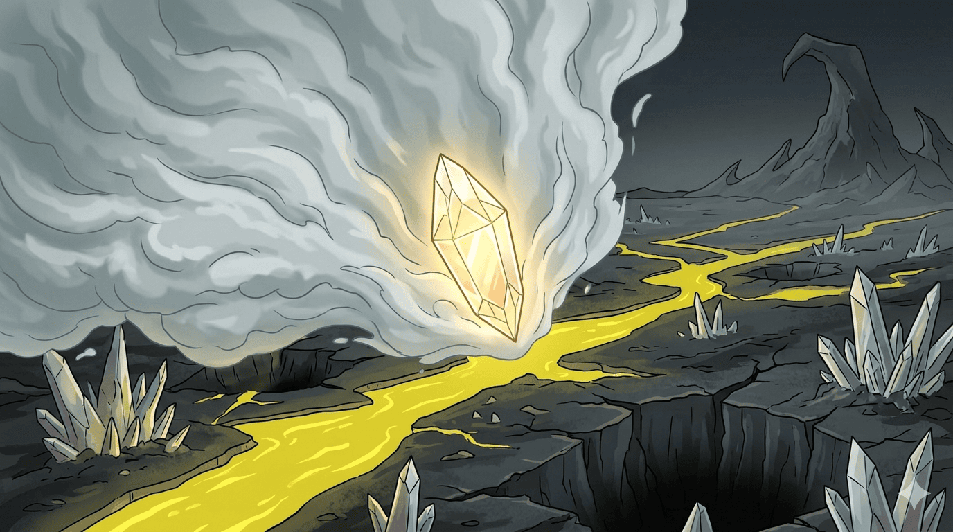 Top-down cinematic aerial view from inside a Concord Jewel crystal orb hovering over a devastated alien wasteland. Below: sulfurous yellow rivers cutting through blackened cracked earth, giant purple crystal formations erupting from the ground, a dead petrified forest with a sickly green glow at its center, a massive hooked mountain in the distance, faint ruins on the surface. The party visible as tiny silhouettes inside the glowing jewel. Colors: sickly yellows, ashen grays, radioactive greens, violet crystal shards.