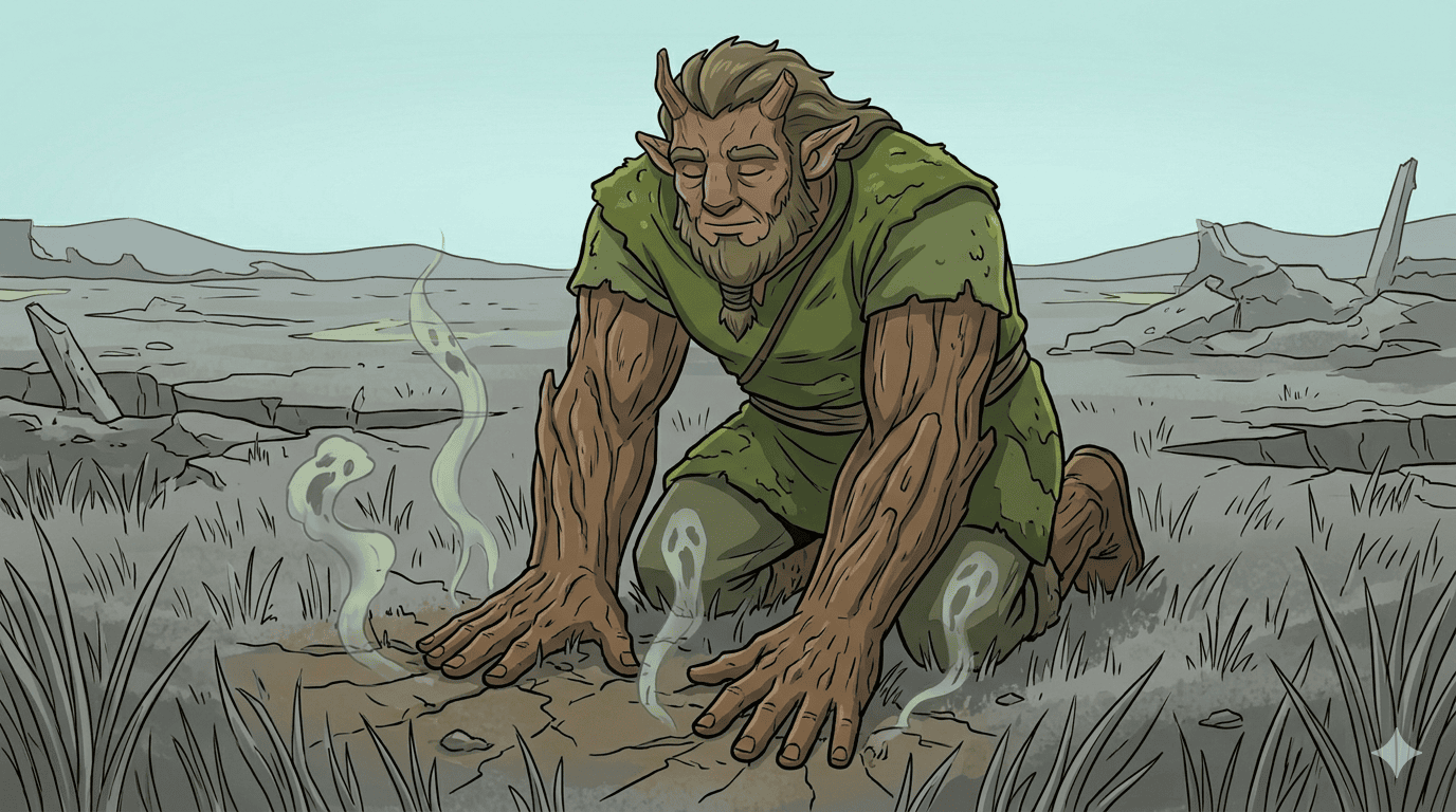 Giant firbolg druid lying flat in sickly gray scrub grass on an alien wasteland, his skin transforming into bark and moss — tree-man form. Eyes glow soft green, hands pressed to cracked earth. Nature spirits swirl around him as translucent glowing whispers. Ancient, patient expression. The rest of the party watching respectfully from a distance. Gray blasted landscape surrounding. No metal on the firbolg. Correct firbolg proportions — massive, gentle, not orc-like. No aggression in the pose. Fey-natural aesthetic.