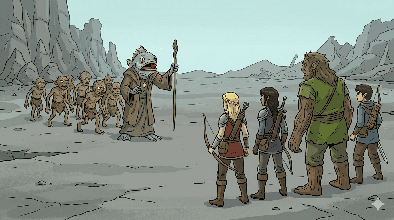 Saturday-morning fantasy cartoon style, wide aspect ratio, bright outlines. The party facing a procession of alien cave-dwellers on a desolate wasteland plain. Seer Ix at the front: a fish-faced aberration humanoid with a wide expressive mouth, leaning on a staff with a trident motif, flanked by small scabrous aberrations plus two towering translucent guardian forms with visible organs in the back. Seer raises a hand in a formal hailing gesture. Party in foreground: golden dragonborn Kiet, giant firbolg Tovin, Aasimar Sundr glowing gold-white, Gemnar the Barbarian, tiny platinum kobold Haru. Two groups facing each other across open wasteland.