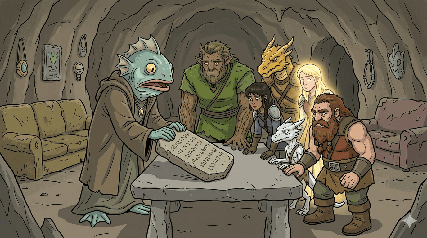 Cramped cave interior with crude stone furniture. The fish-faced Seer Ix slams a heavy ancient stone tablet onto a rough stone table, one long fingernail tracing alien script on its surface. Tablet glows faintly with residual magic. Sundr leans forward reading it, eyes wide. Party members crowd around. Cave walls behind: stacked stone tablets, crude organic bone-and-crystal decorations. Lighting: dim cave glow plus Sundr’s golden aura reflecting off the tablet.
